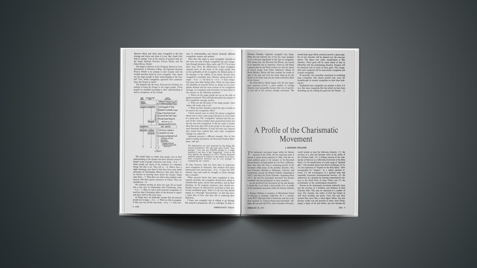 As one involved in the movement for the past decade, I should like to set forth a brief profile of it. A profile of the charismatic movement within the historic churches would include at least the following elements: (1) the recovery of a vital and dynamic sense of the reality of the Christian faith; (2) a striking renewal of the community of believers as a fellowship (koinonia) of the Holy Spirit; (3) the manifestation of a wide range of “spiritual gifts,” with parallels drawn from First Corinthians 12–14; (4) the experience of “baptism in the Holy Spirit,” often accompanied by “tongues,” as a radical spiritual renewal; (5) the re-emergence of a spiritual unity that essentially transcends denominational barriers; (6) the rediscovery of a dynamic for bearing comprehensive witness to the Good News of Jesus Christ; and (7) the revitalization of the eschatological perspective.