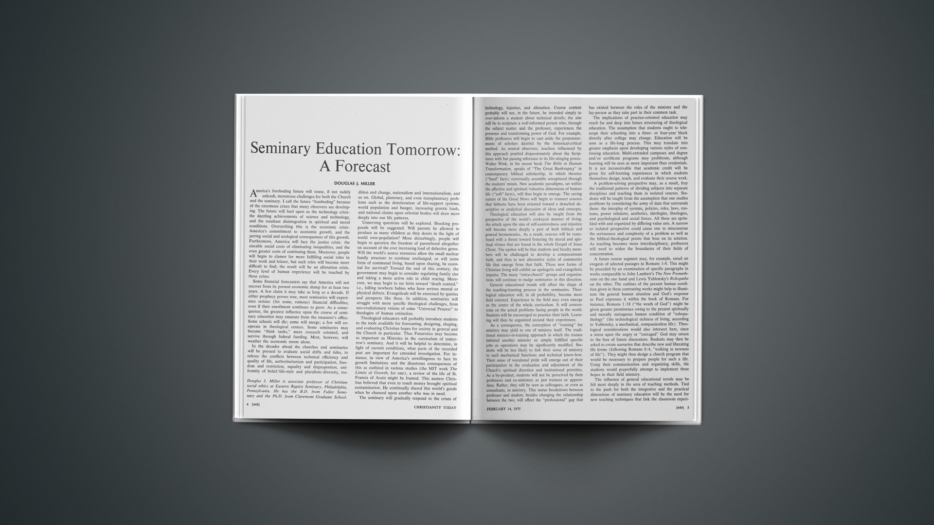 America’s foreboding future will rouse, if not rudely unleash, monstrous challenges for both the Church and the seminary. I call the future “foreboding” because of the enormous crises that many observers see developing. The future will hurl upon us the technology crisis: the dazzling achievements of science and technology, and the resultant disintegration in spiritual and moral conditions. Overarching this is the economic crisis: America’s commitment to economic growth, and the jarring social and ecological consequences of this growth. Furthermore, America will face the justice crisis: the sizeable social costs of eliminating inequalities, and the even greater costs of continuing them. Moreover, people will begin to clamor for more fulfilling social roles in their work and leisure, but such roles will become more difficult to find; the result will be an alienation crisis. Every level of human experience will be touched by these crises.