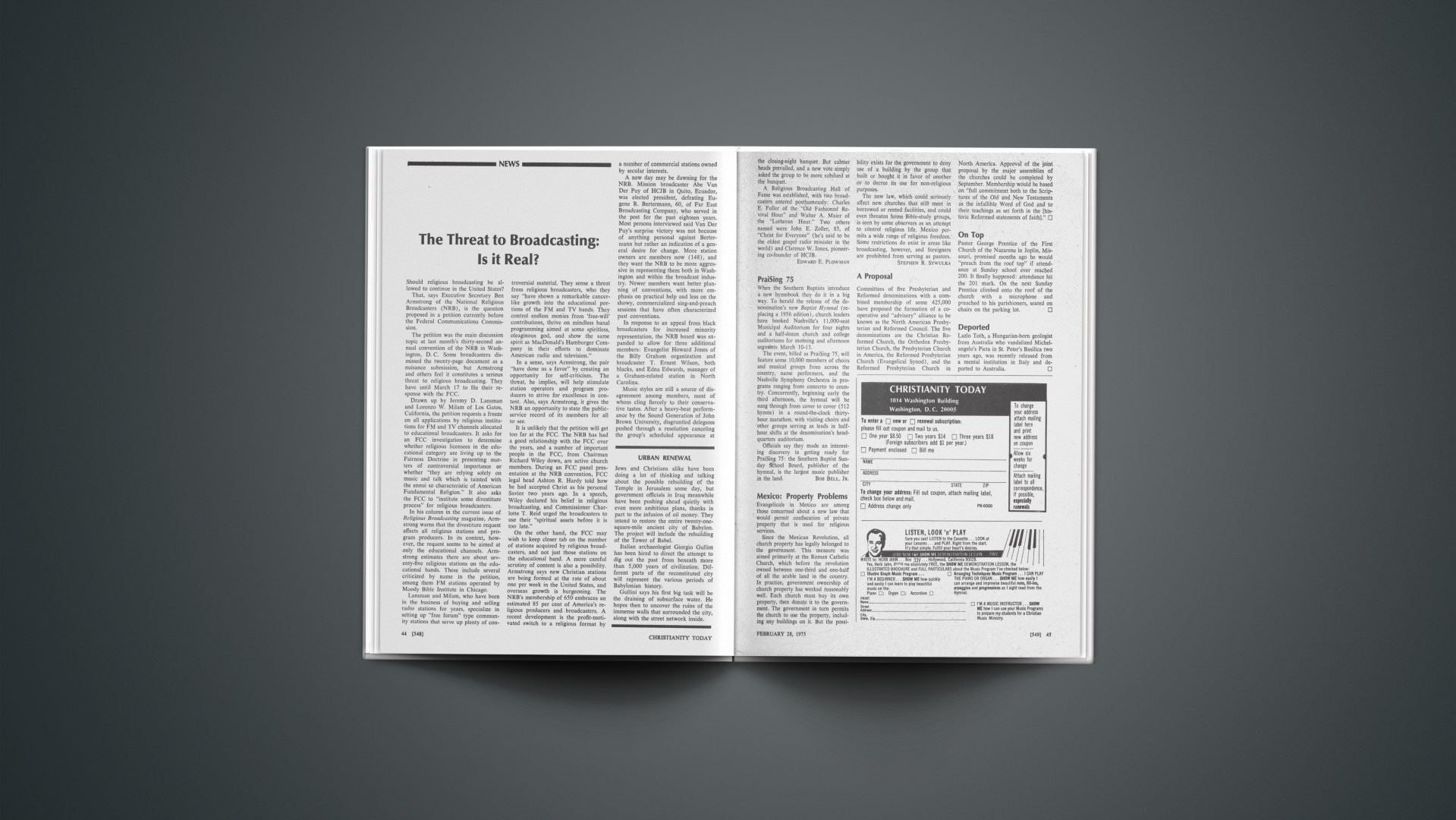 It is unlikely that the petition will get too far at the FCC. The NRB has had a good relationship with the FCC over the years, and a number of important people in the FCC, from Chairman Richard Wiley down, are active church members. During an FCC panel presentation at the NRB convention, FCC legal head Ashton R. Hardy told how he had accepted Christ as his personal Savior two years ago. In a speech, Wiley declared his belief in religious broadcasting, and Commissioner Charlotte T. Reid urged the broadcasters to use their “spiritual assets before it is too late.”