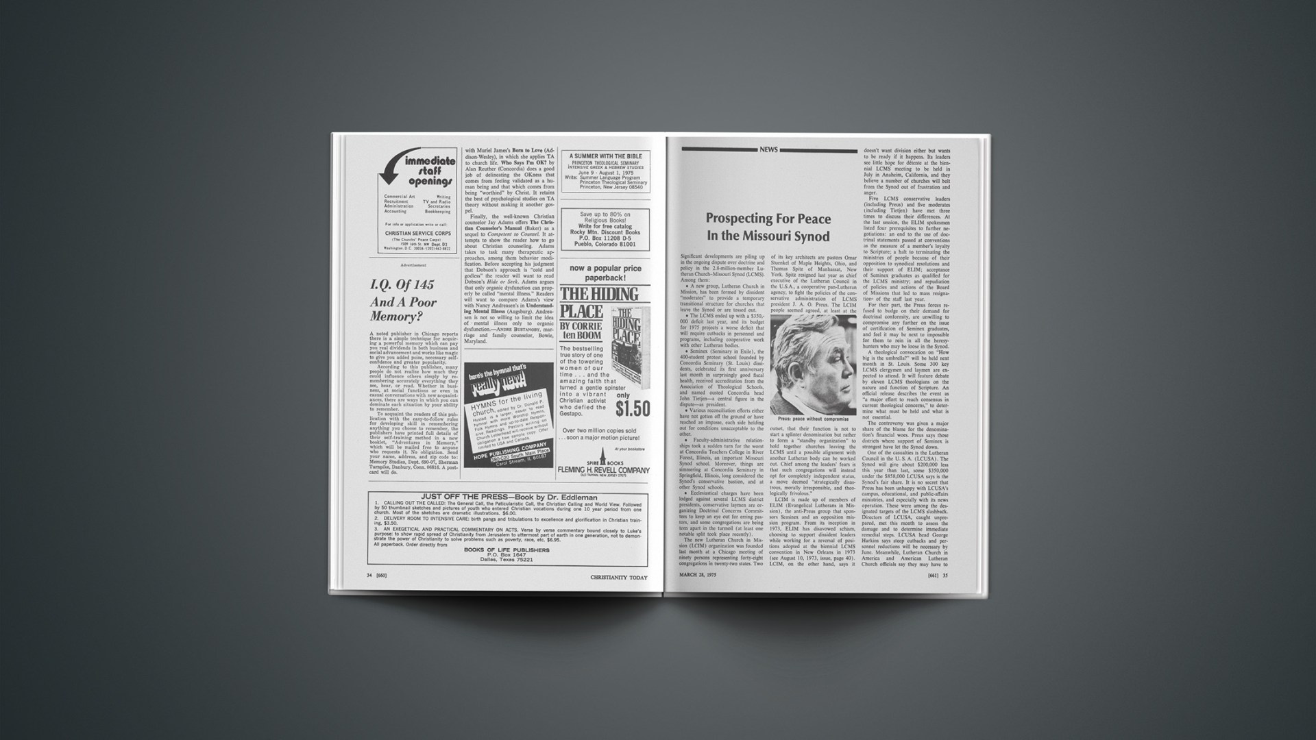 Teachers have also been leaving Concordia Seminary in Springfield, where Robert Preus (brother of the LCMS president) was named president last year. One of them, Victor Bohlmann—brother of Concordia, St. Louis, acting president Ralph Bohlmann—criticized the board’s delayed-tenure policies. “It’s not possible for me to work in an institution which lacks integrity,” he said in quitting.