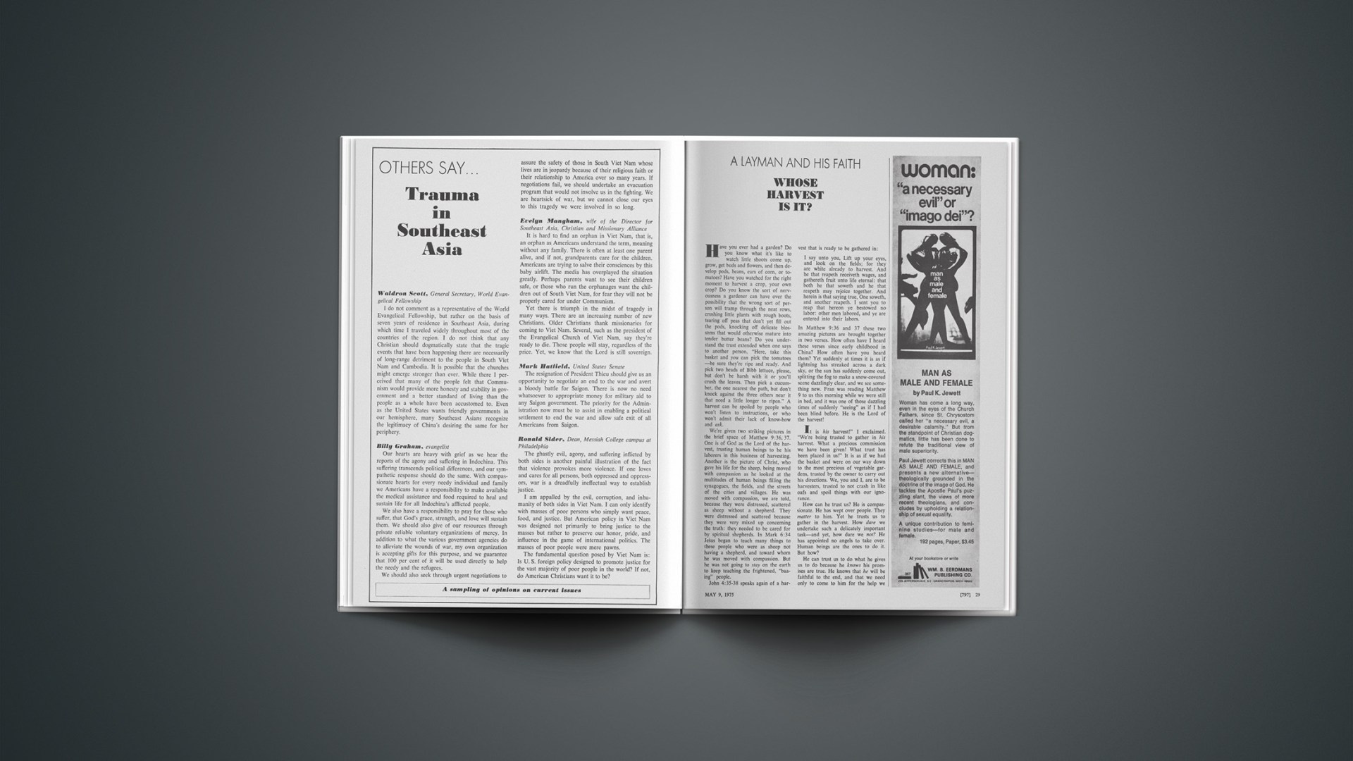 Last summer we noted editorially that the lower speed limit of fifty-five miles per hour saves lives (see July 26 issue, page 24). New statistics have reinforced this fact. The Department of Transportation estimates that about 45,000 people were killed in traffic accidents last year, compared with 55,100 in 1973—a reduction of 18 per cent. As the traveling season approaches we want to remind our readers again to think as Christians while driving. Obey speed limits and drive courteously. That not only conserves energy but also conserves lives. And concern for lives is part of what being a Christian means.