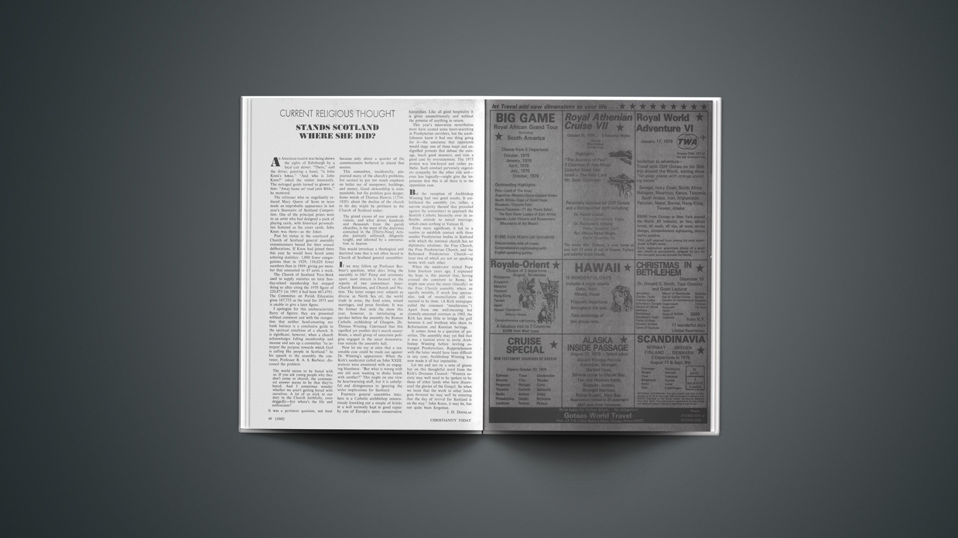 If we may follow up Professor Barbour’s question, what does bring the assembly to life? Pomp and ceremony apart, most interest is focused on the reports of two committees: Inter-Church Relations, and Church and Nation. The latter ranges over subjects as diverse as North Sea oil, the world trade in arms, the food crisis, mixed marriages, and press freedom. It was the former that stole the show this year, however, in introducing as speaker before the assembly the Roman Catholic archbishop of Glasgow, Dr. Thomas Winning. Convinced that this signified yet another day’s march nearer Rome, a small group of uncertain pedigree engaged in the usual demonstration outside the assembly hall.