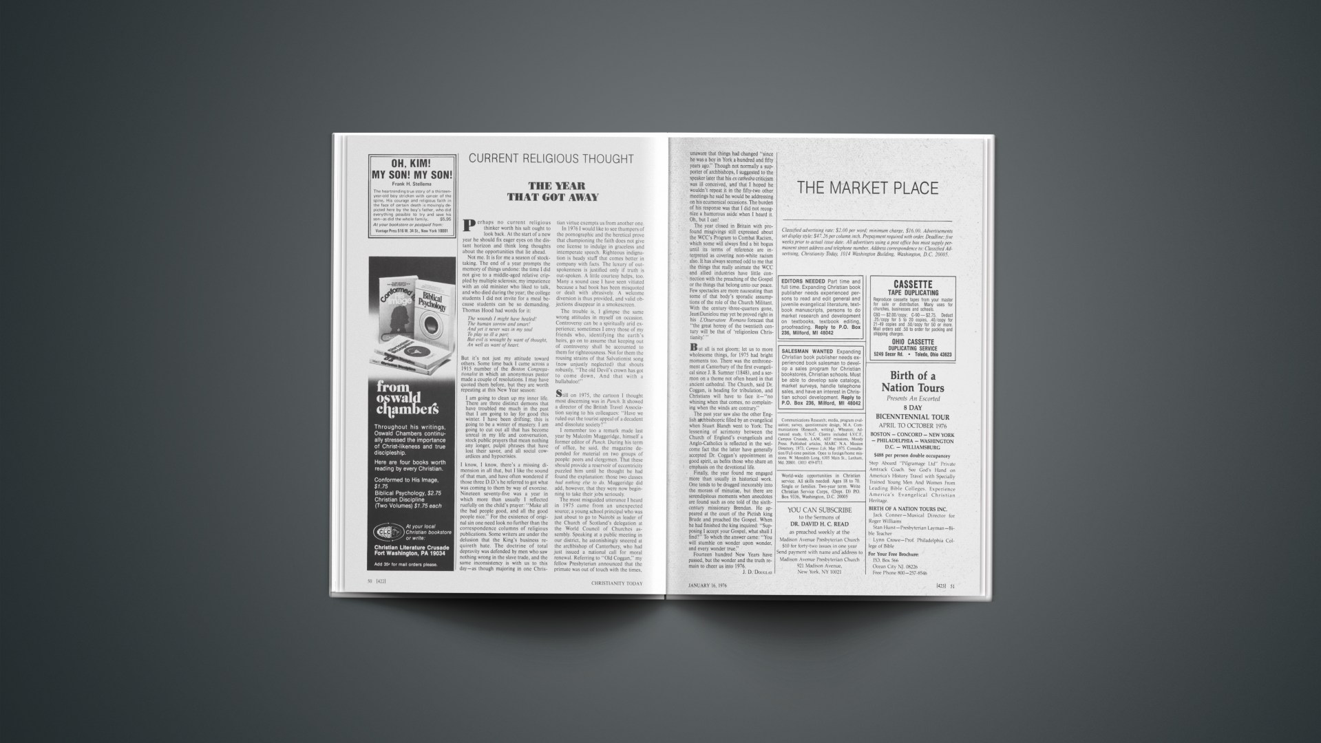 But all is not gloom; let us to more wholesome things, for 1975 had bright moments too. There was the enthronement at Canterbury of the first evangelical since J. B. Sumner (1848), and a sermon on a theme not often heard in that ancient cathedral. The Church, said Dr. Coggan, is heading for tribulation, and Christians will have to face it—“no whining when that comes, no complaining when the winds are contrary.”