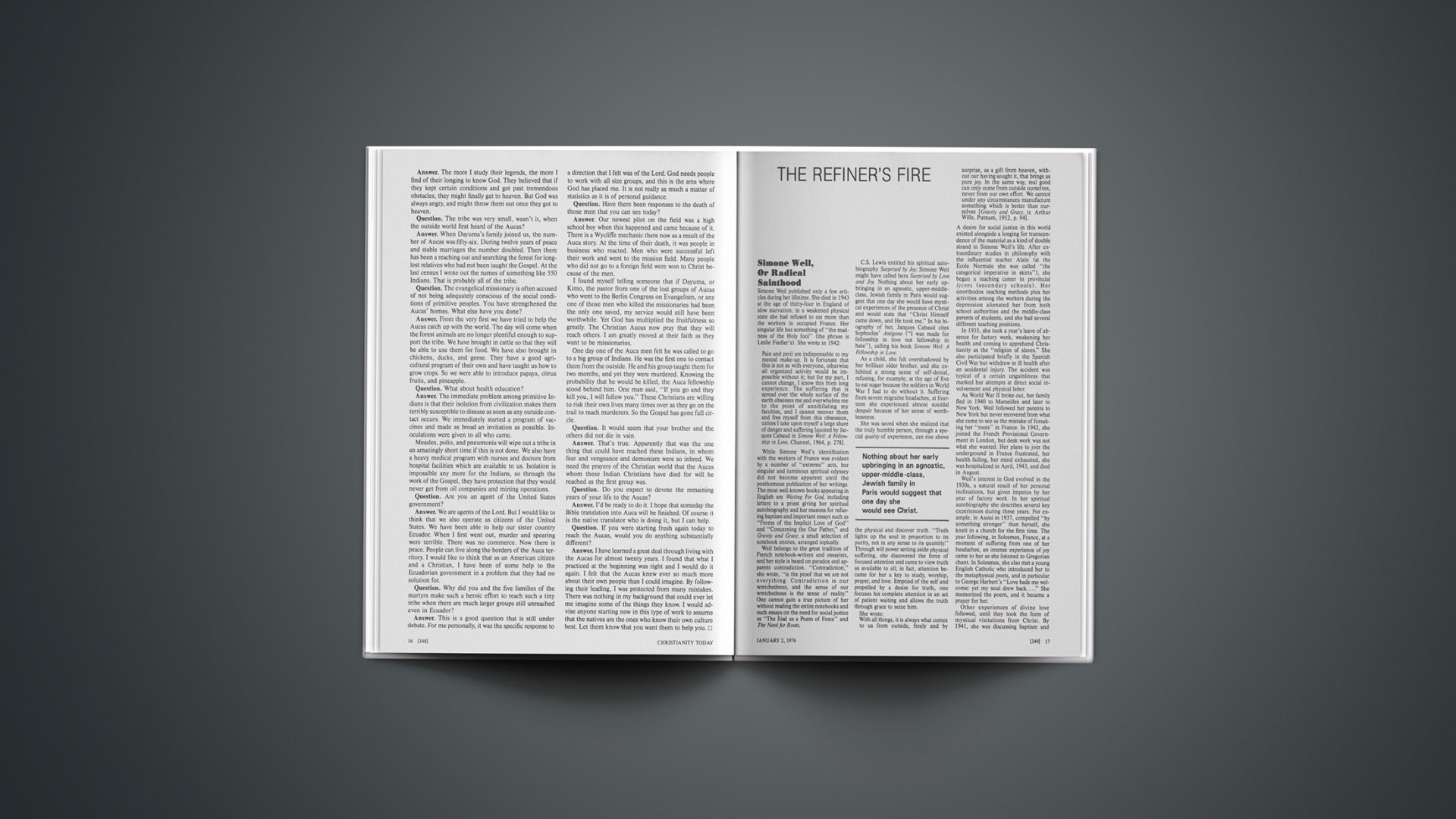 In 1935, she took a year’s leave of absence for factory work, weakening her health and coming to apprehend Christianity as the “religion of slaves.” She also participated briefly in the Spanish Civil War but withdrew in ill health after an accidental injury. The accident was typical of a certain ungainliness that marked her attempts at direct social involvement and physical labor.
