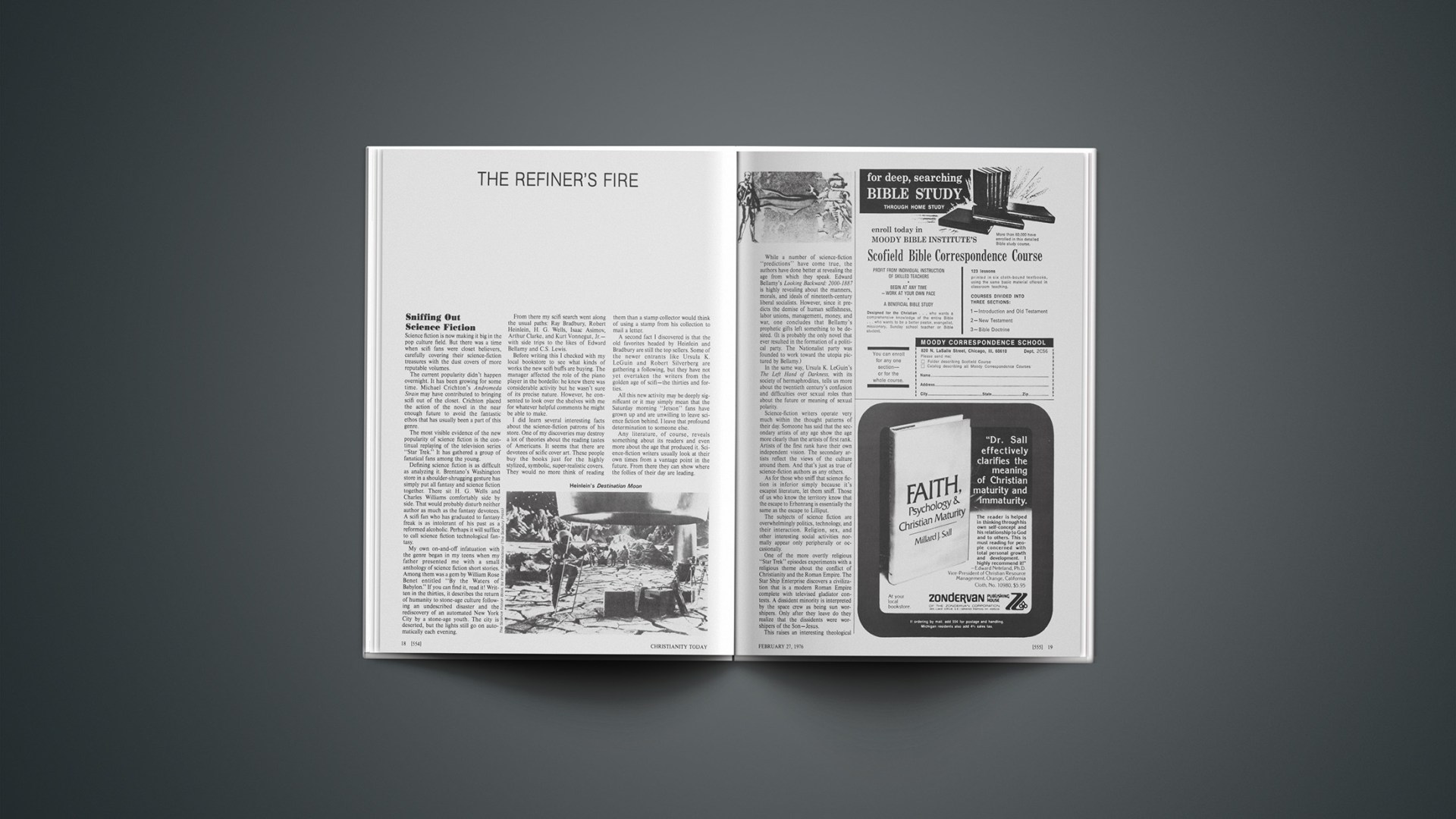 C. S. Lewis’s work, of course, falls into a special category. One of his striking devices was the assumption that the inhabitants of another planet might never have rebelled against God. Since the woods are full of Lewis thralls ready to pounce on any critic who might make a misstatement about the master, let me simply say that Lewis has produced what—at this point—is the ultimate in theological science fiction.