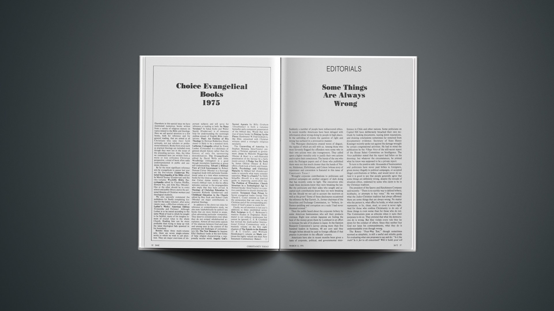 Besides these three multi-volume sets, there are seven single-volume works to which we wish to call attention. They are major overviews of important subjects and will serve for reference or reading or both. So Many Versions? by Sakae Kubo and Walter Specht (Zondervan) is of immense help for understanding the seemingly endless stream of English Bible translations. Paul: An Outline of His Theology by Herman Ridderbos (Eerdmans) is likely to be a standard work. Lutheran Cyclopedia edited by Erwin Lueker (Concordia) is a dictionary of general church history rather than the history of only the sponsoring denomination. The Evangelicals edited by David Wells and John Woodbridge (Abingdon) is a good though incomplete beginning at group self-understanding. Toward a Biblical View of Civil Government by Robert Duncan Culver (Moody) is a thorough exegetical study with particular foundational value at a time when numerous books for the times are appearing. Note that Culver claims merely to write toward a biblical view; in this he offers welcome contrast to the propagandists who imply that they have arrived. A Theology of Christian Education by Lawrence Richards (Zondervan) and Childhood Education in the Church edited by Roy Zuck and Robert Clark (Moody) are major contributions to practical theology.