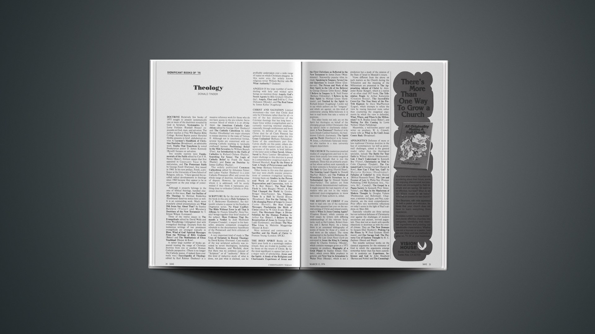 Three of the twelve essays in The Evangelicals edited by David Wells and John Woodbridge (Abingdon) deal with evangelical theology. Excerpts from the numerous writings of two prominent evangelicals are arranged topically in Blow, Wind of God! Spirited Messages From the Writings of Billy Graham (Baker) and The Meditations of Elton Trueblood (Harper & Row).