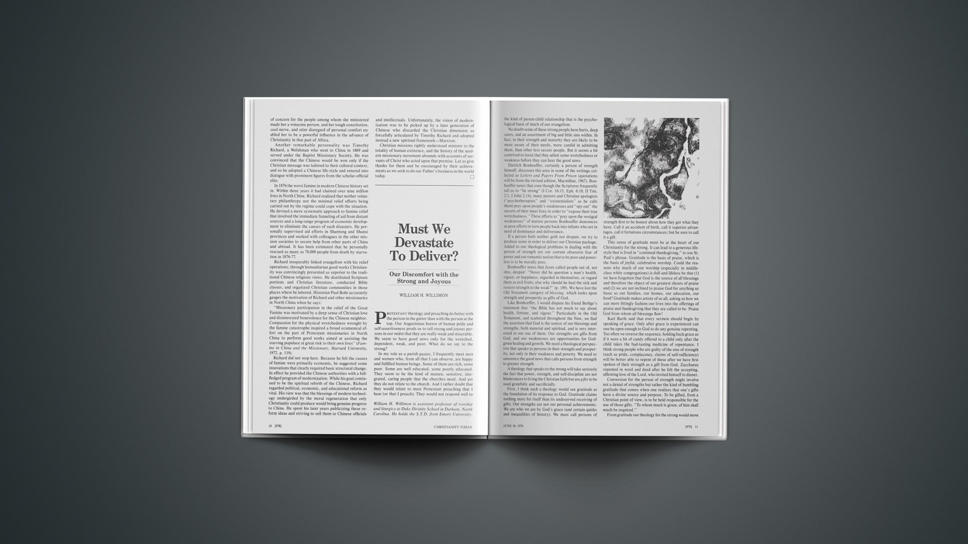 Dietrich Bonhoeffer, certainly a person of strength himself, discusses this area in some of the writings collected as Letters and Papers From Prison (quotations will be from the revised edition, Macmillan, 1967). Bonhoeffer notes that even though the Scriptures frequently tell us to “be strong” (1 Cor. 16:13, Eph. 6:10, 2 Tim. 2:1; 1 John 2:14), many pastors and Christian apologists (“psychotherapists” and “existentialists” as he calls them) prey upon people’s weaknesses and “spy out” the secrets of their inner lives in order to “expose their true wretchedness.” These efforts to “prey upon the vestigial weaknesses” of mature persons Bonhoeffer denounces as poor efforts to turn people back into infants who are in need of dominance and deliverance.
