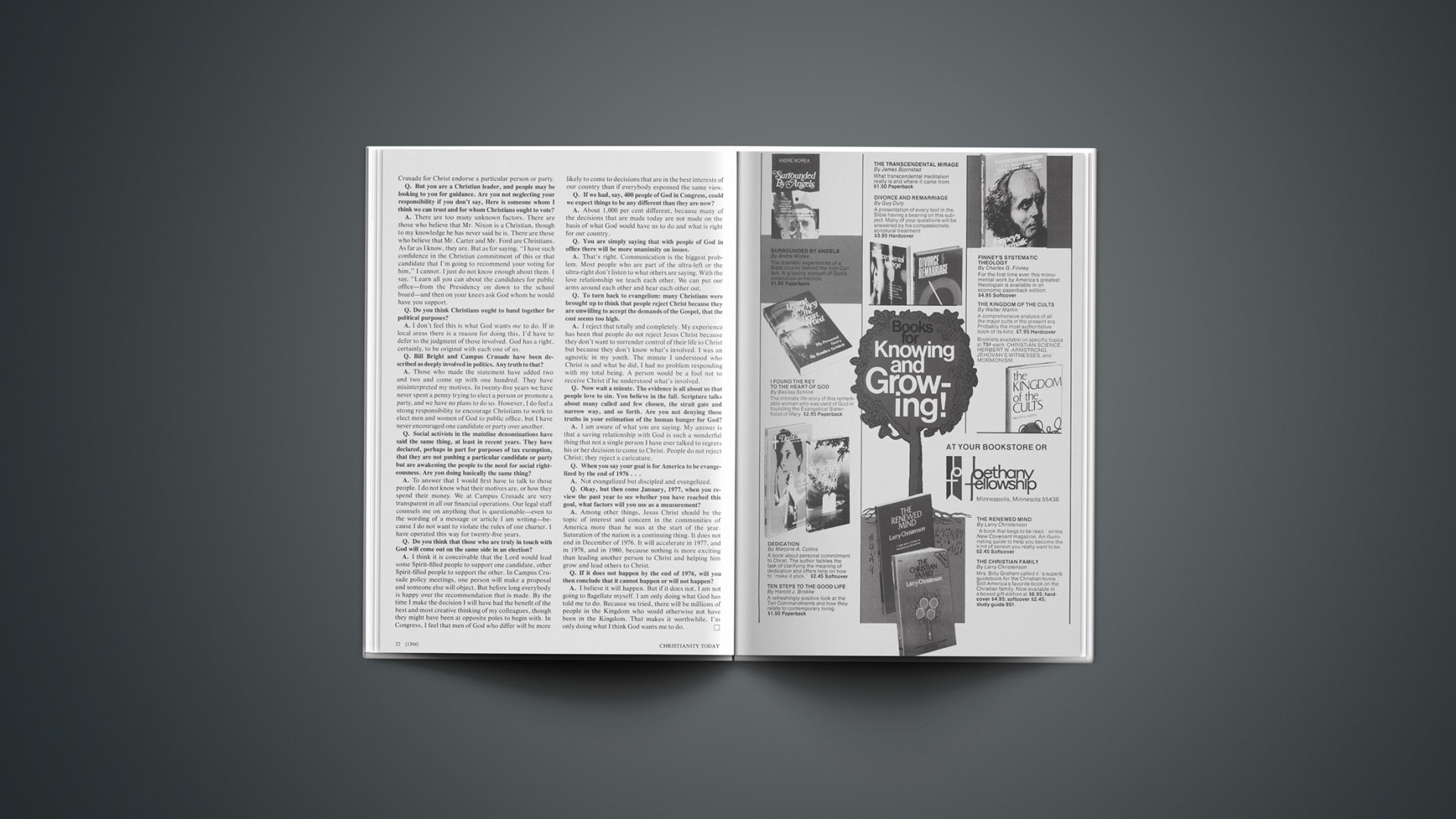 What started as an evangelistic effort among college students has turned into one of the more ambitious undertakings in church history. The man behind the movement, Dr. William Rohl Bright, traces its origin to a call from God that came to him while he was studying for a Greek examination at Fuller Seminary. His organization, Campus Crusade for Christ International, is marking its twenty-fifth anniversary this fall by developing strategy to help to evangelize the entire world. Political activities surrounding Bright’s evangelistic endeavors and his association with Arizona congressman John Conlan and other conservative political leaders have attracted the attention of the news media in recent weeks. To get a firsthand account of his political interests and evangelistic vision, CHRISTIANITY TODAYeditors interviewed Bright at the “Christian Embassy” in Washington. Here is an edited version of that interview: