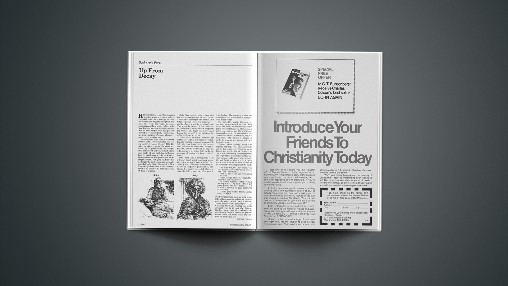 John Gardner, who lives in Vermont, takes us to this stubborn land and its people in October Light (Knopf, $10). Despite its mixed reviews, the novel was named by all publications that compile such lists one of last year’s most significant books (it was published in December). As its title suggests, the book hovers between seasons, not quite winter but no longer autumn. Not quite the future but no longer the past. A present unequally mixed of both. Eerie. Shadowed. A New England light in October is hard to see by; much of the action of the book takes place at dusk or evening.