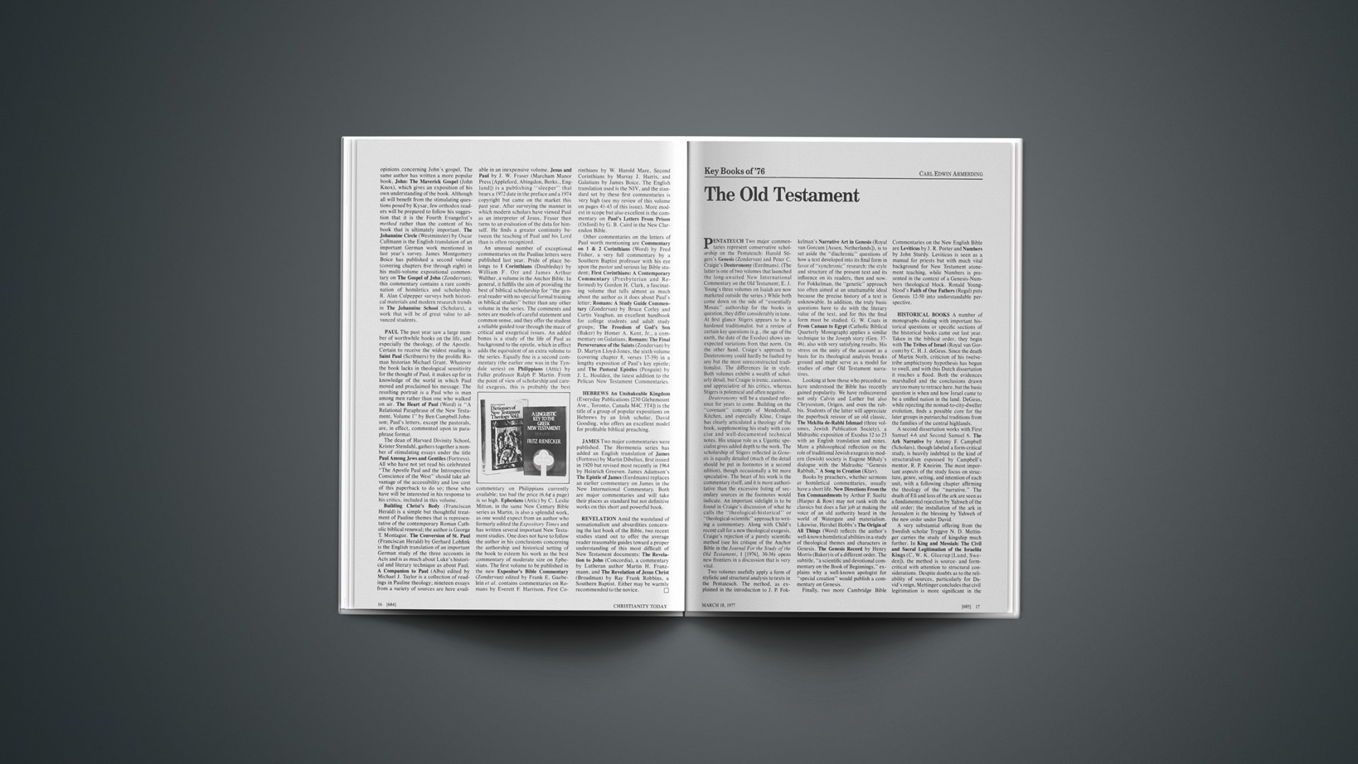 Deuteronomy will be a standard reference for years to come. Building on the “covenant” concepts of Mendenhall, Kitchen, and especially Kline, Craigie has clearly articulated a theology of the book, supplementing his study with concise and well-documented technical notes. His unique role as a Ugaritic specialist gives added depth to the work. The scholarship of Stigers reflected in Genesis is equally detailed (much of the detail should be put in footnotes in a second edition), though occasionally a bit more speculative. The heart of his work is the commentary itself, and it is more authoritative than the excessive listing of secondary sources in the footnotes would indicate. An important sidelight is to be found in Craigie’s discussion of what he calls the “theological-historical” or “theological-scientific” approach to writing a commentary. Along with Child’s recent call for a new theological exegesis, Craigie’s rejection of a purely scientific method (see his critique of the Anchor Bible in the Journal For the Study of the Old Testament, I [1976], 30–36) opens new frontiers in a discussion that is very vital.