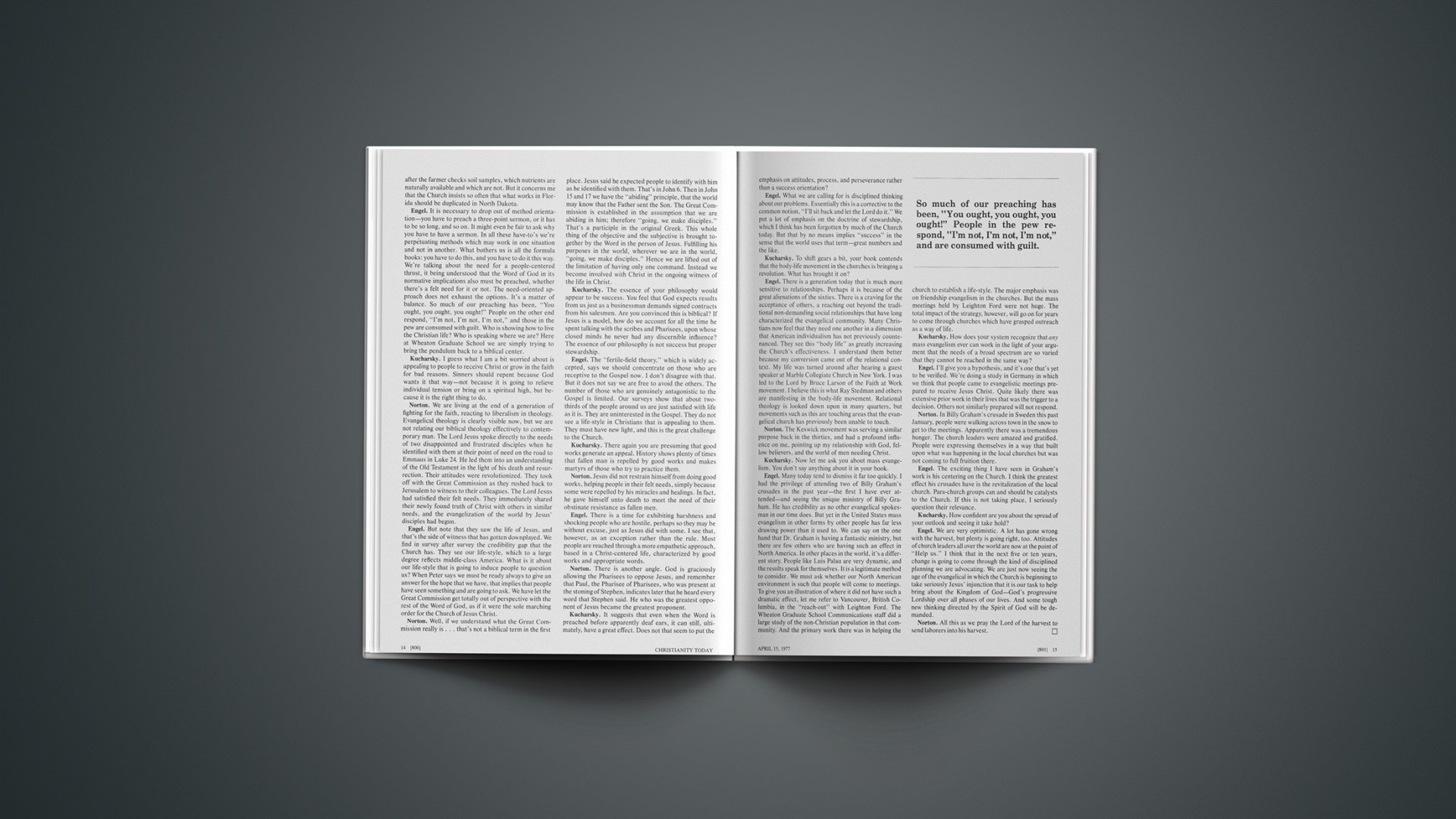 Engel. It is necessary to drop out of method orientation—you have to preach a three-point sermon, or it has to be so long, and so on. It might even be fair to ask why you have to have a sermon. In all these have-to’s we’re perpetuating methods which may work in one situation and not in another. What bothers us is all the formula books: you have to do this, and you have to do it this way. We’re talking about the need for a people-centered thrust, it being understood that the Word of God in its normative implications also must be preached, whether there’s a felt need for it or not. The need-oriented approach does not exhaust the options. It’s a matter of balance. So much of our preaching has been, “You ought, you ought, you ought!” People on the other end respond, “I’m not, I’m not, I’m not,” and those in the pew are consumed with guilt. Who is showing how to live the Christian life? Who is speaking where we are? Here at Wheaton Graduate School we are simply trying to bring the pendulum back to a biblical center.