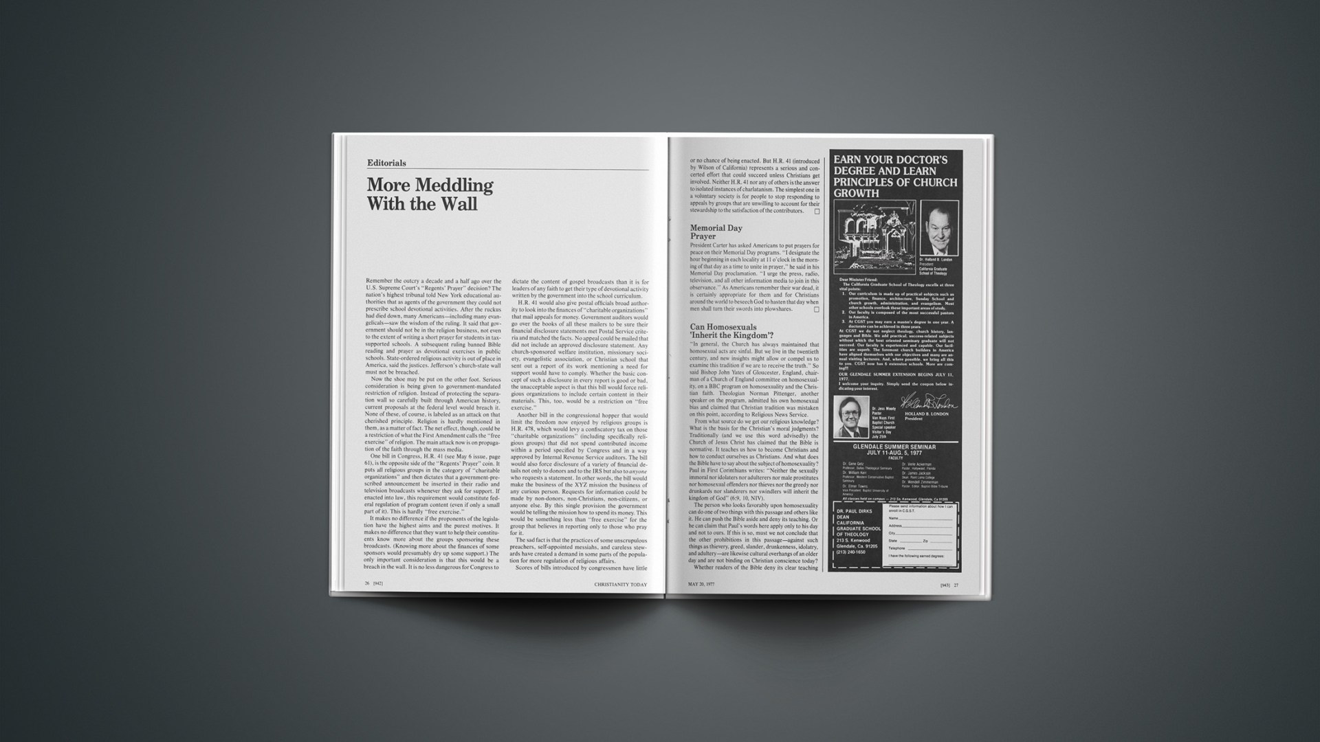 Remember the outcry a decade and a half ago over the U.S. Supreme Court’s “Regents’ Prayer” decision? The nation’s highest tribunal told New York educational authorities that as agents of the government they could not prescribe school devotional activities. After the ruckus had died down, many Americans—including many evangelicals—saw the wisdom of the ruling. It said that government should not be in the religion business, not even to the extent of writing a short prayer for students in tax-supported schools. A subsequent ruling banned Bible reading and prayer as devotional exercises in public schools. State-ordered religious activity is out of place in America, said the justices. Jefferson’s church-state wall must not be breached.