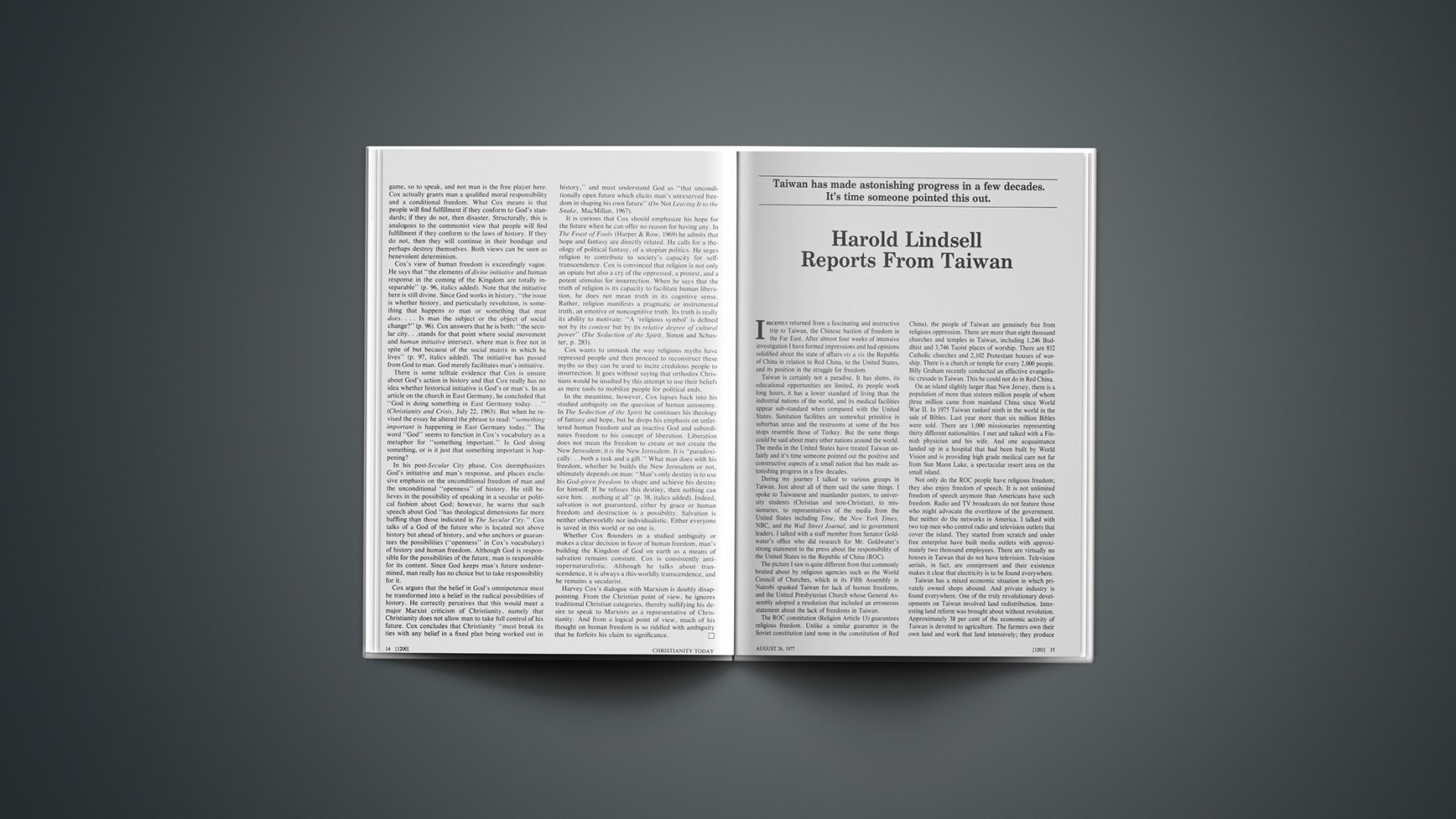 There is some telltale evidence that Cox is unsure about God’s action in history and that Cox really has no idea whether historical initiative is God’s or man’s. In an article on the church in East Germany, he concluded that “God is doing something in East Germany today …” (Christianity and Crisis, July 22, 1963). But when he revised the essay he altered the phrase to read: “something important is happening in East Germany today.” The word “God” seems to function in Cox’s vocabulary as a metaphor for “something important.” Is God doing something, or is it just that something important is happening?