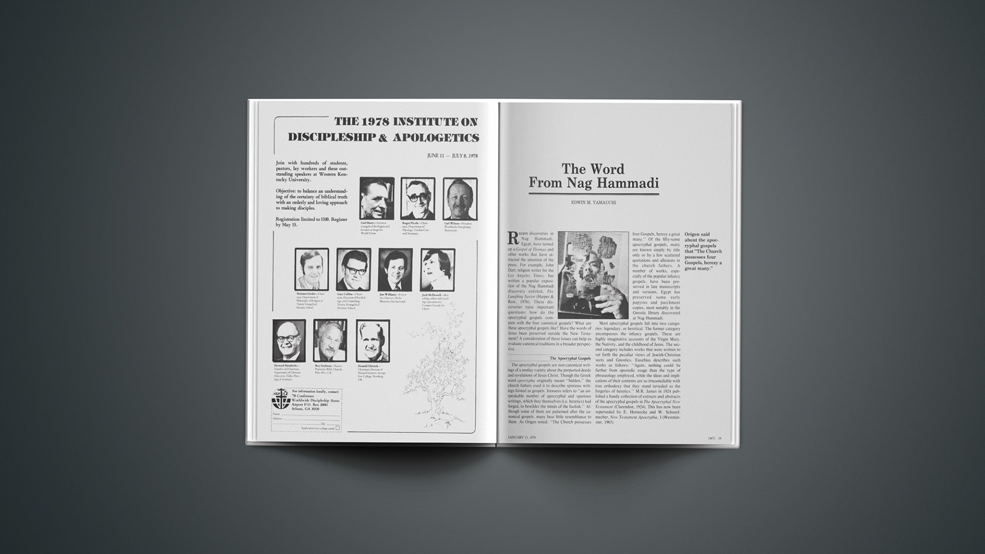 Recent discoveries in Nag Hammadi, Egypt, have turned up a Gospel of Thomas and other works that have attracted the attention of the press. For example, John Dart, religion writer for the Los Angeles Times, has written a popular exposition of the Nag Hammadi discovery entitled. The Laughing Savior (Harper & Row, 1976). These discoveries raise important questions: how do the apocryphal gospels compare with the four canonical gospels? What are these apocryphal gospels like? Have the words of Jesus been preserved outside the New Testament? A consideration of these issues can help us evaluate canonical traditions in a broader perspective.