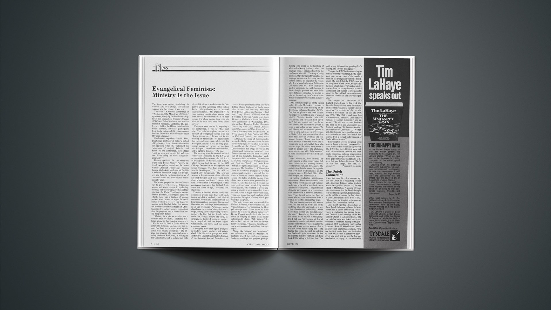 The meeting was the second national conference sponsored by the EWC, an organization that grew out of a task force of Evangelicals for Social Action in 1974, which in turn had its roots in the 1973 Chicago Declaration of Evangelicals for Social Concern. The first conference, held in Washington, D.C., in 1975, attracted 350 participants. The average woman at Pasadena was a little older (in her mid-thirties), and there were more church women and fewer “counter-culture” women than at Washington. “This conference indicates that biblical feminism has come of age,” declared Ms. Hestenes.