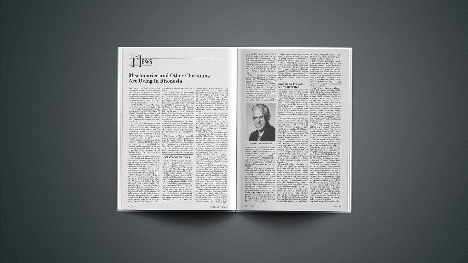 June was the bloodiest month yet for missionaries caught in the six-year-old guerrilla war in Rhodesia. Twenty missionaries and dependents died violent deaths in the southern African nation last month. Unofficial reports put at sixteen the number who were killed in the previous eighteen months.