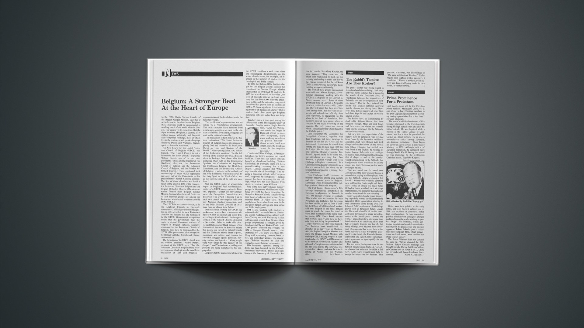 On New Year’s Day the United Protestant Church of Belgium (UPCB) was formed. “This United Church is not a federation, but a new church,” explained Wilfred Hoyois, one of its two vice-presidents. “It is a uniting together of two [Walloon] churches, the Protestant Church of Belgium and the Reformed Church of Belgium, and the Flemish Reformed Church.” Their combined total membership of about 40,000 represents just over half of the Protestants in this predominantly Roman Catholic country. The first of these churches was itself a result of the union in 1969 of the Evangelical Protestant Church of Belgium and the Belgian Methodist Church. (The denomination formed from Belgian Gospel Mission-founded churches and Pentecostal and Brethren groups are among the Protestants who elected to remain outside of the UPCB.)