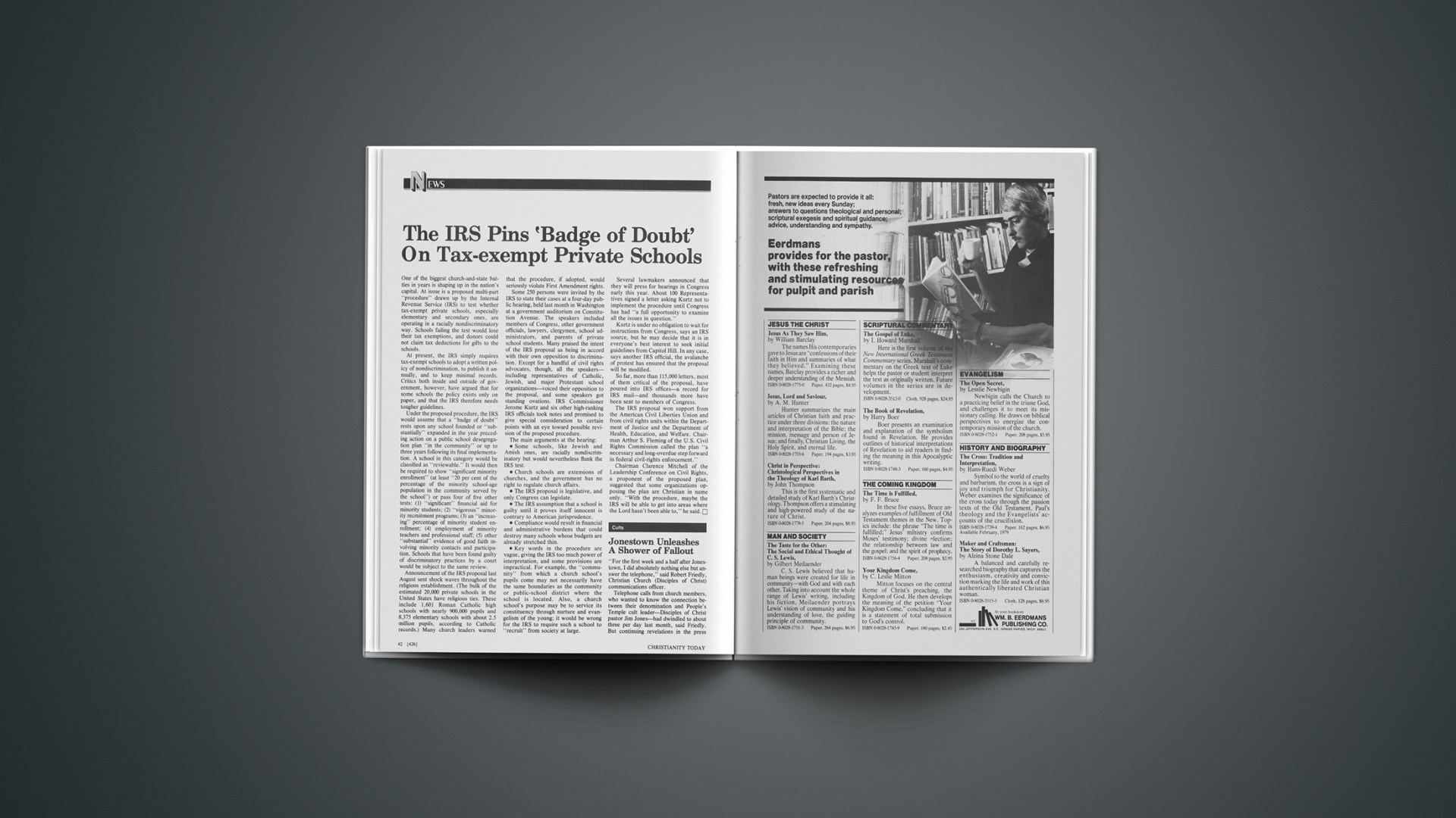One of the biggest church-and-state battles in years is shaping up in the nation’s capital. At issue is a proposed multi-part “procedure” drawn up by the Internal Revenue Service (IRS) to test whether tax-exempt private schools, especially elementary and secondary ones, are operating in a racially nondiscriminatory way. Schools failing the test would lose their tax exemptions, and donors could not claim tax deductions for gifts to the schools.