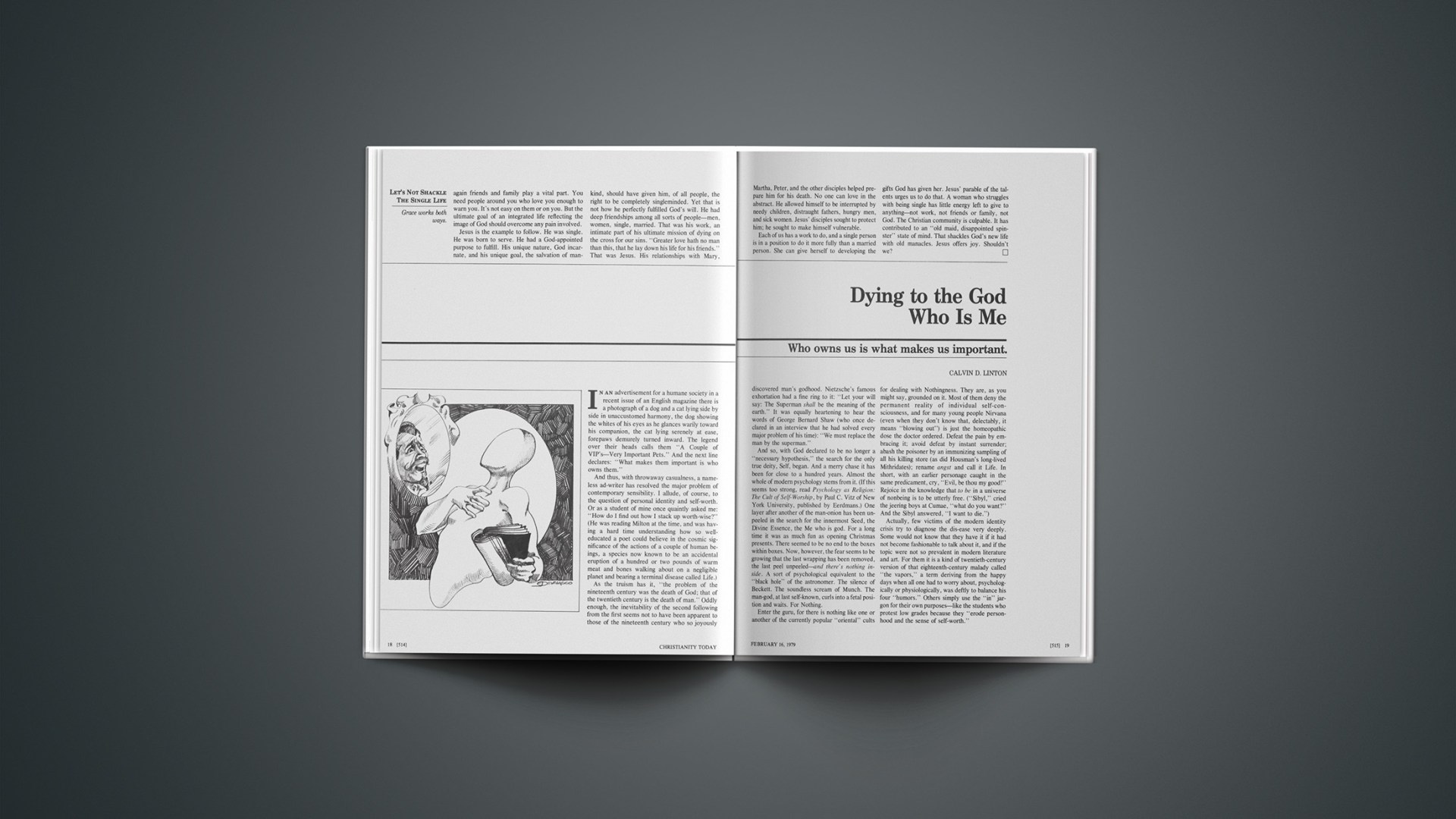 Even at the mundane level, people generally recognize that it is not self-consciousness which gives us our identity (we may think that we are Napoleon, or an isosceles triangle) but others’ consciousness of us. If we were to move about unseen, unheard, and unnoticed by others, we should doubt our own reality. And it is on the esteem of others that we base our self-esteem. At least we use the principle every time we try to enhance our importance. “I’m sure Mr. Bigboss will see me,” we coolly tell the officious receptionist; “I’m an old friend of his.” It is always more a matter of who knows us, and with what degree of esteem, than of how many know us. Not to be in the mind of anyone, not to be loved by anyone, is (like Mrs. Dalloway in Virginia Woolf’s novel of the same name) to be dead. “I am forgotten as a dead man out of mind,” laments David (Ps. 31:12).