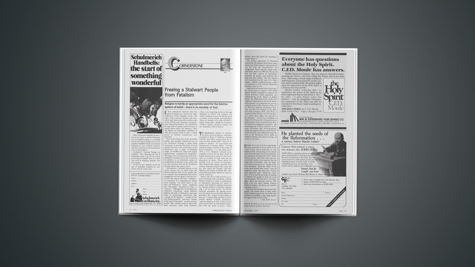 Anglican involvement in the Arctic may be traced back to August 1578 when Robert Wolfall, Chaplain to Admiral Sir Martin Frobisher’s third expedition, administered the Lord’s Supper on Baffin Island. The 400th anniversary of this first Anglican Communion on the North American continent was celebrated last year by a special synod of the Diocese of the Artic. The first Anglican missionary, however, was the first chaplain to the Hudson’s Bay Company (1820), John West, a convert of John Wesley. In 1876 the Rev. E. J. Peck, often called “the Apostle to the Eskimos,” arrived from England to pioneer for 48 years the Christian mission in the eastern Arctic around Hudson Bay. He believed in indigenous principles, and encouraged the Eskimo churches to become self-reliant and self-propagating. Today the Anglican Diocese of the Arctic, which stretches some 2000 miles from Inuvik at the Mackenzie River Delta to Northern Quebec, has about 30 clergy, of whom 12 are Inuit.