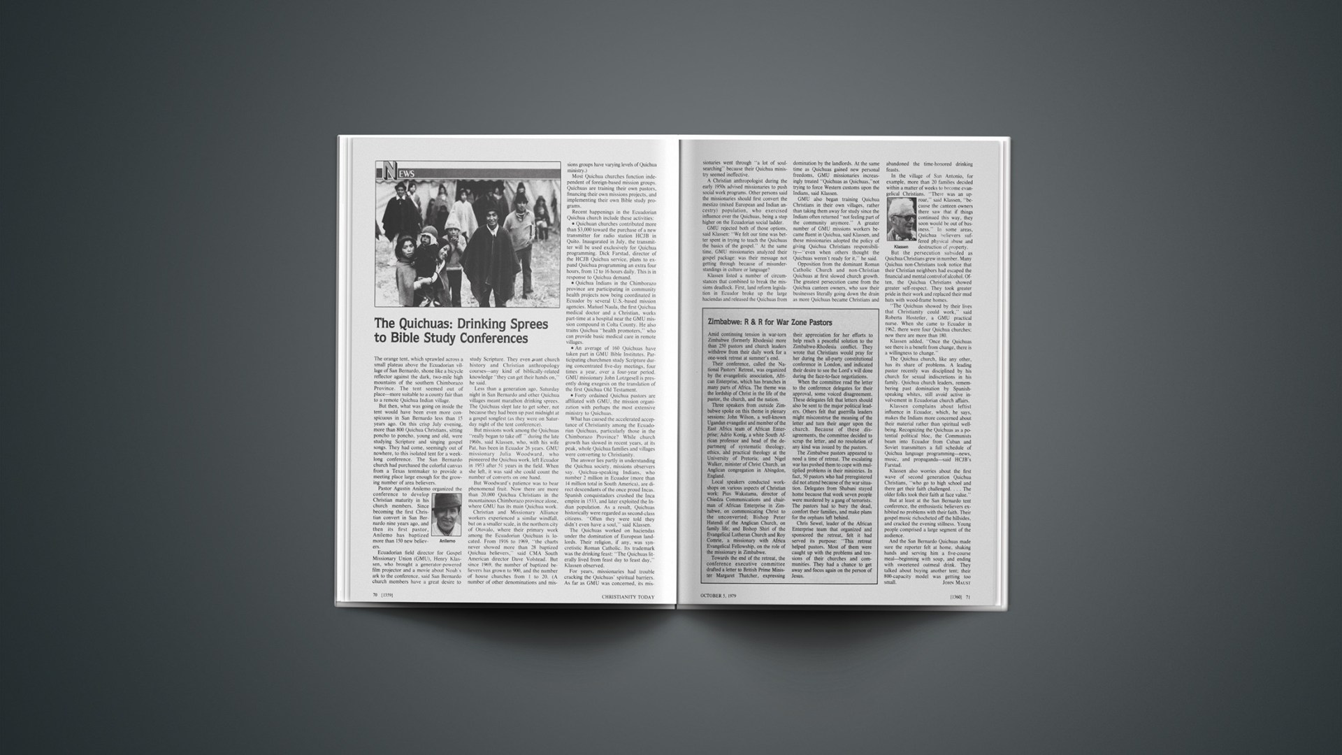 • Quichua Indians in the Chimborazo province are participating in community health projects now being coordinated in Ecuador by several U.S.-based mission agencies. Mañuel Naula, the first Quichua medical doctor and a Christian, works part-time at a hospital near the GMU mission compound in Colta County. He also trains Quichua “health promoters,” who can provide basic medical care in remote villages.
