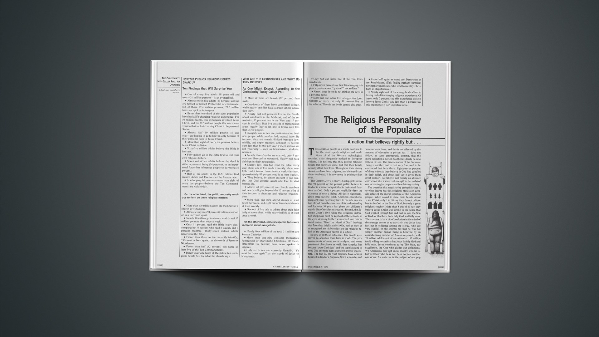 The CHRISTIANITY TODAY—Gallup poll shows that 94 percent of the general public believe in God or in a universal spirit that in their mind functions as God. Only 4 percent explicitly deny the existence of such a Being. All this is significant, given three factors: First, American educational philosophy has rigorously tried to exclude any notion of God from the structure of its understanding and for over 50 years has given our children a steady diet of secular instruction. Second, the Supreme Court’s 1964 ruling that religious instruction and prayer must be kept out of the schools, in the eyes of many further secularized our educational system. Third, the “death of God” theology that flourished briefly in the 1960s, had, as most of us suspected, no visible effect on the religious beliefs of the American people as a whole.