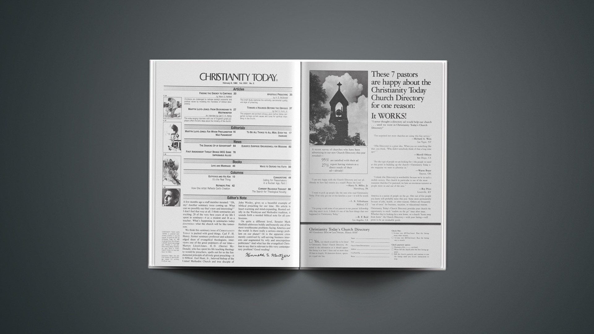 We think this seminary issue of CHRISTIANITY TODAY is packed with good things. Carl F. H. Henry, former seminary professor and acknowledged dean of evangelical theologians, interviews one of the great pulpiteers of our time—Martyn Lloyd-Jones. H. D. (Derrie) McDonald, who has spent his life teaching theology to would-be preachers, spells out for us the fundamental principle of all truly great preaching—it is biblical. Earl Hunt, Jr., beloved bishop of the United Methodist Church and true disciple of John Wesley, gives us a beautiful example of biblical preaching for our time. His article is heart-warming and mind-expanding. Rooted solidly in the Wesleyan and Methodist tradition, it sounds forth a needed biblical note for all confessions.