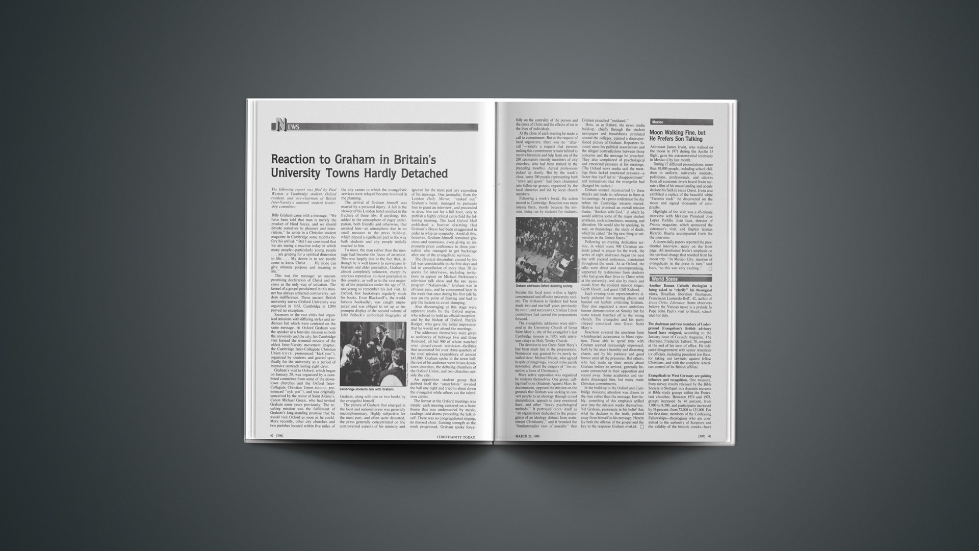 Reactions covered the spectrum from wholehearted acceptance to blunt rejection. Those able to spend time with Graham seemed increasingly impressed, both by the man’s humility and disarming charm, and by his patience and good humor amid all the pressures. But others, who had made up their minds about Graham before he arrived, generally became entrenched in their opposition and stayed away. Some academics and students disparaged him, but many made Christian commitments.