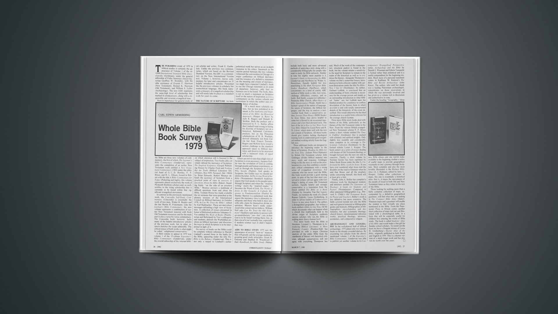 AIDS TO BIBLE STUDY 1979 saw the appearance of several “how-to” manuals that will greatly aid the average student in grasping good study principles. Grant R. Osborne and Stephen B. Woodward in their Handbook for Bible Study (Baker) include both basic and more advanced methods of analyzing a text, along with a considerable bibliography for people who want to study the Bible seriously. Similar in tone but slightly more popular is A Layman’s Guide to Interpreting the Bible (Zondervan and NavPress) by Walter A. Henrichsen. Equally helpful but less penetrating is the short Navigator Bible Studies Handbook (NavPress), which concentrates on a kind of catchy ABC method of Bible study (a title, best verse, challenge, difficulties, essence, and so forth). Bob Smith, a pastor in California’s Peninsula Bible Church, offers Basics of Bible Interpretation (Word). Smith has a layman’s grasp of the nature of language, the nature of Scripture, the biblical languages, and the way to analyze a text. Another book from a conservative author, Sweeter Than Honey (BHM Books) by Jesse Deloe, may prove helpful to some but is flawed by an occasional inaccuracy and a less than elevated style. The best of the lot is How to Get More From Your Bible (Baker) by Lloyd Perry and R. D. Culver, which deals well with the text and content of Scripture. All these books should give readers lacking theological training tools to understand good exegetical method working strictly from the English text.