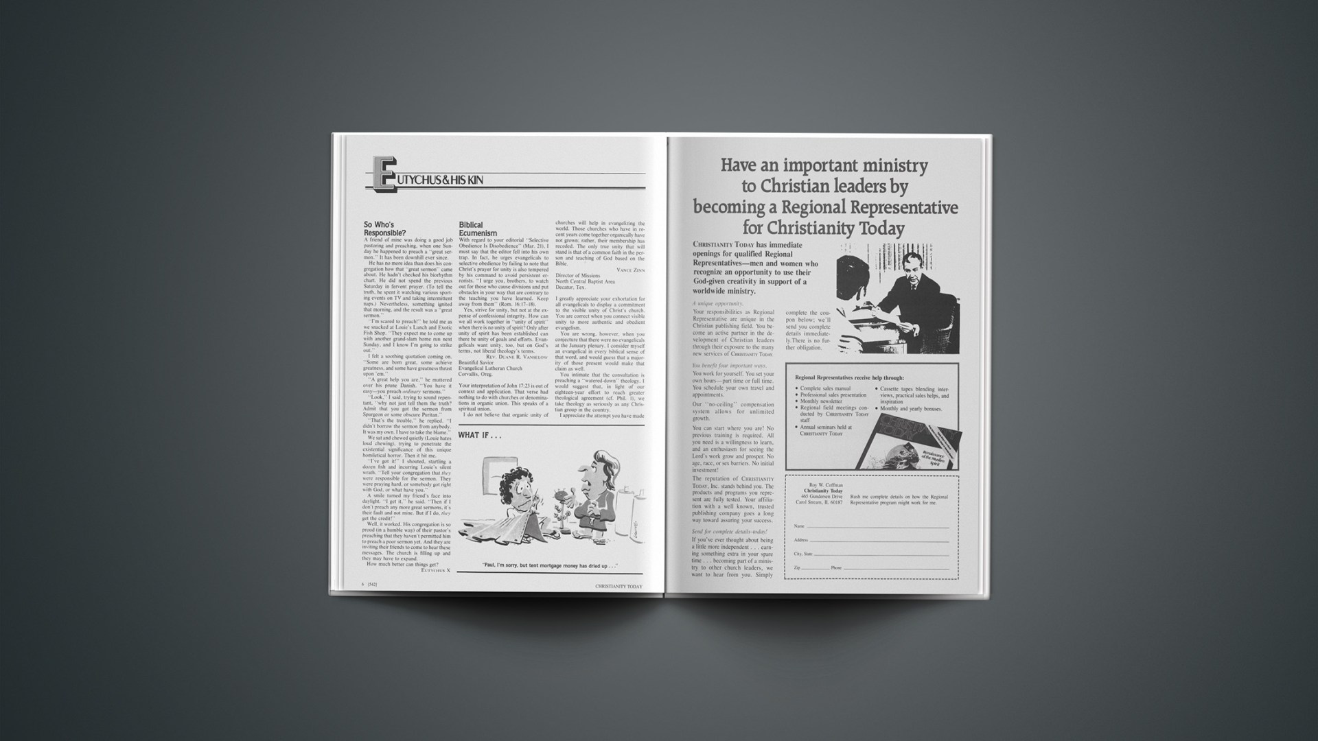 With regard to your editorial “Selective Obedience Is Disobedience” (Mar. 21), I must say that the editor fell into his own trap. In fact, he urges evangelicals to selective obedience by failing to note that Christ’s prayer for unity is also tempered by his command to avoid persistent errorists. “I urge you, brothers, to watch out for those who cause divisions and put obstacles in your way that are contrary to the teaching you have learned. Keep away from them” (Rom. 16:17–18).