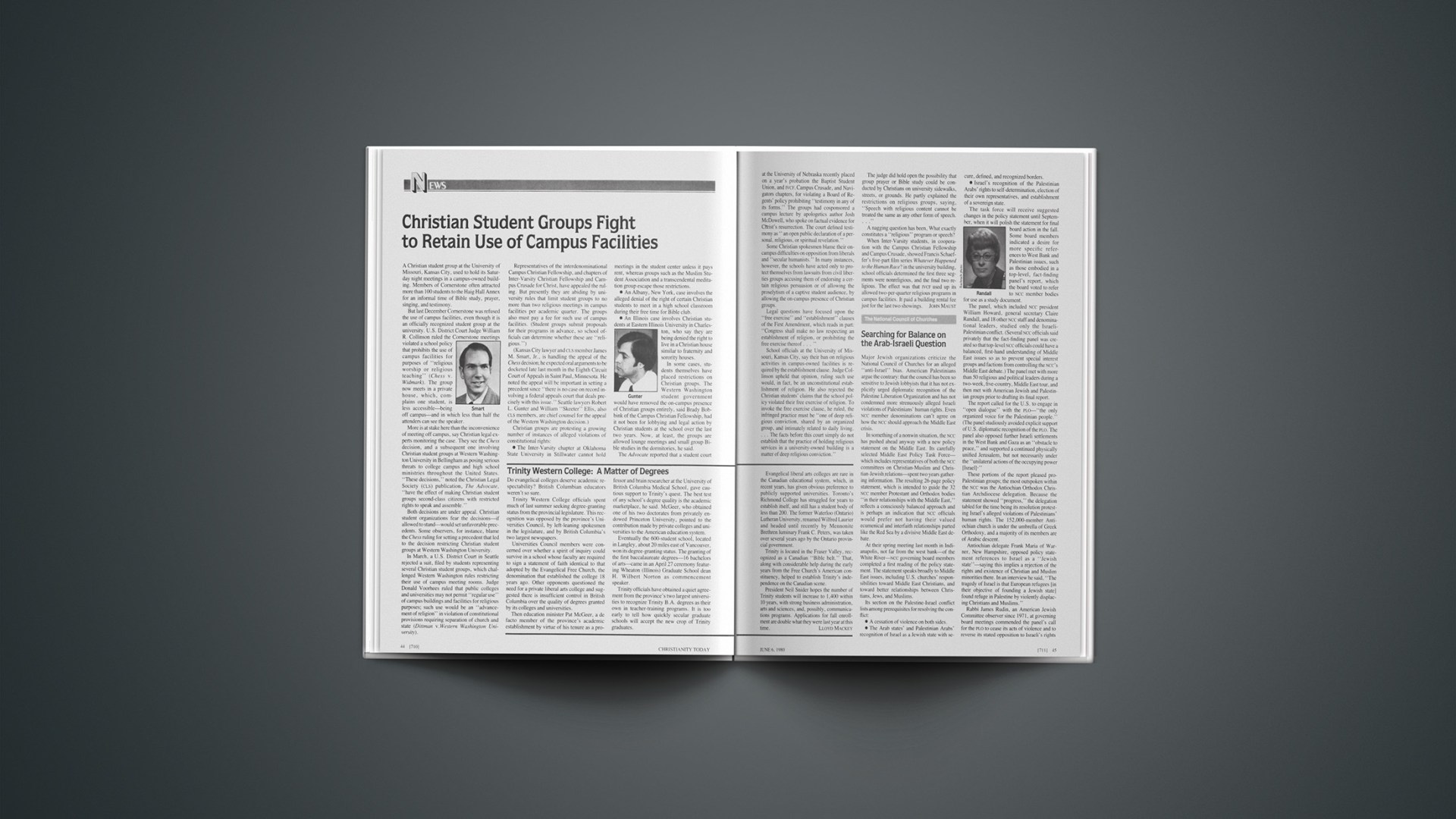 Representatives of the interdenominational Campus Christian Fellowship, and chapters of Inter-Varsity Christian Fellowship and Campus Crusade for Christ, have appealed the ruling. But presently they are abiding by university rules that limit student groups to no more than two religious meetings in campus facilities per academic quarter. The groups also must pay a fee for such use of campus facilities. (Student groups submit proposals for their programs in advance, so school officials can determine whether these are “religious.”)