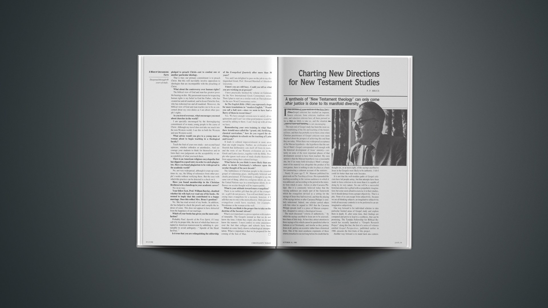 Several years ago Professor Dennis Nineham remarked that the task of today’s historian of Christian origins is “to wring truth relevant to the history of Jesus from the increasing stock of remains of the Judaism of his time.” There is no need to restrict the field of research to Judaism, but even in Judaism there is still ample room for research in the voluminous material available. Professor E. P. Sanders’s Paul and Palestinian Judaism (Fortress, 1977) showed how fresh insights can be obtained from a thorough reexamination of familiar material; not everything has been said even about Paul in relation to rabbinic theology. Who will undertake a comparable study of “Jesus and Palestinian Judaism”? Our knowledge of Palestinian Judaism itself has not stood still, thanks to the research of Jacob Neusner and others into the situation before A.D. 70; some of these new findings could profitably be applied to New Testament exegesis.