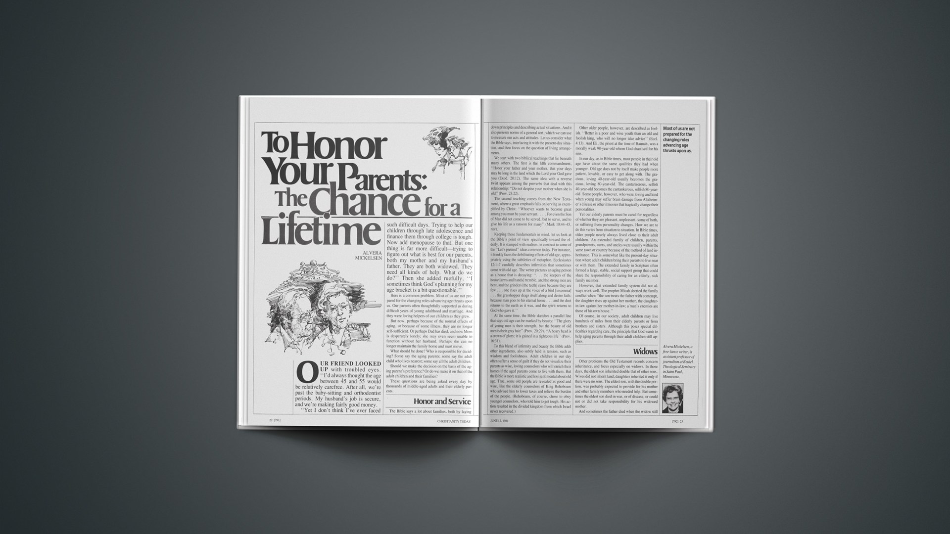 The question many adult Christians are facing is, “How can I meet the needs of my elderly parents and still handle my other responsibilities? How do I honor my father and mother when a change in their living arrangement has to be made?” Is the loving and honoring course always to take the aging parent into the home of the adult child?