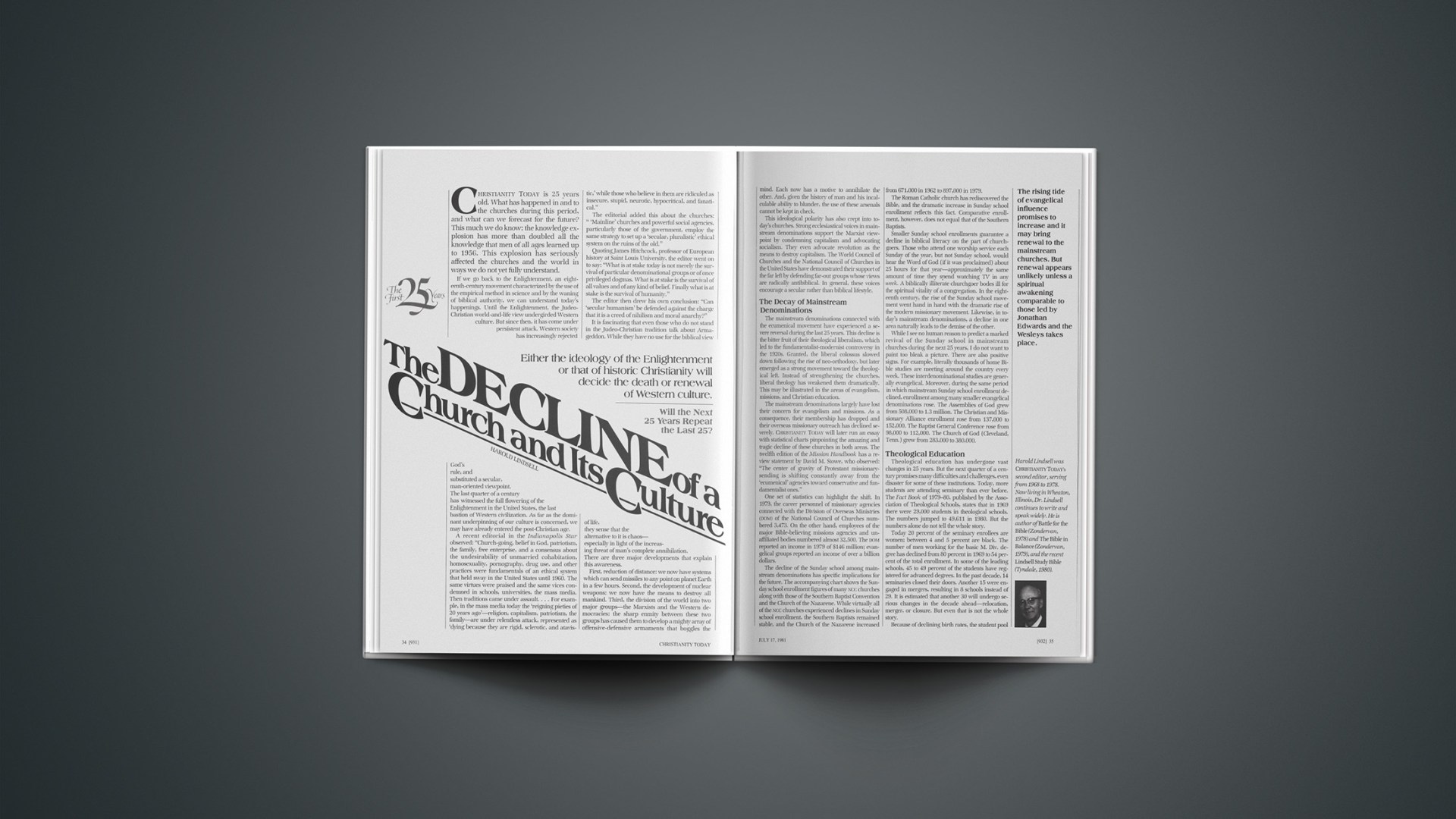 In the last 25 years, liberalism’s biggest guns were silenced, marking the end of an age. Tillich, Barth, Brunner, Bonhoeffer, Bultmann, and Niebuhr passed from the scene. Instead, evangelicals came to the forefront to carry the faith in almost every field—Billy Graham in evangelism and missionary outreach, Francis Schaeffer and Edward John Carnell in apologetics, Harold Ockenga in evangelical cooperation and theological education, and Clyde Taylor in evangelical political activity. In the magazine world were Sherwood Wirt of Decision, Donald Grey Barnhouse of Eternity, and Carl Henry and Kenneth Kantzer of CHRISTIANITY TODAY, to name only a few.