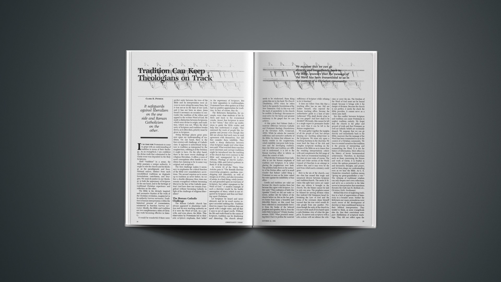 Doing theology places great pressure upon my understanding of tradition. On one hand, there is the four-century-old challenge of Catholicism. It appears to subordinate Scripture to tradition as interpreted by the magisterium, robbing it of the freedom it ought to have. On the other hand, there is the more recent challenge of religious liberalism. It offers a wave of novel conceptions often hostile to tradition but claiming to be in some way original and scriptural.