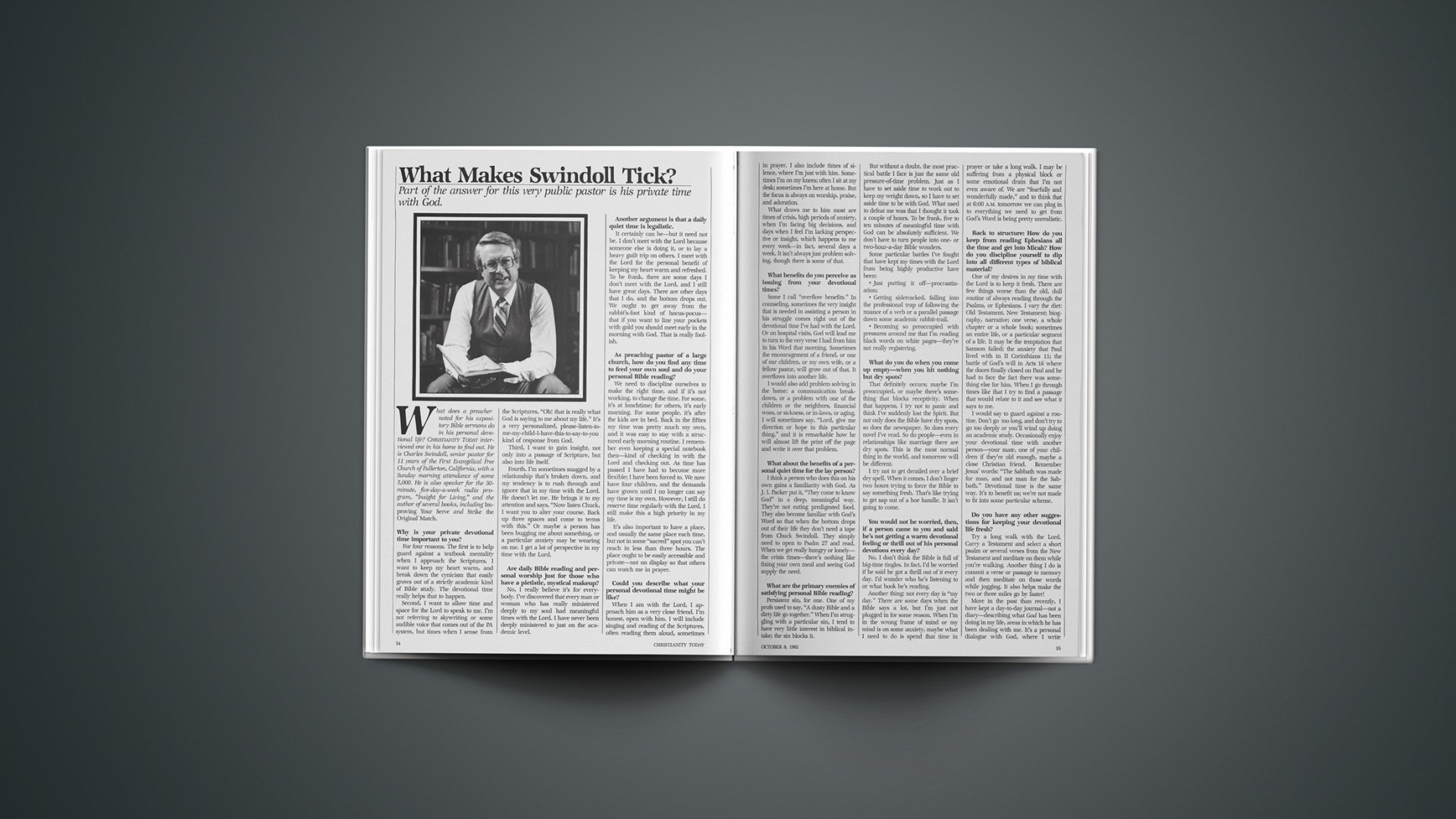 What does a preacher noted for hisexpository Bible sermons do in his personal devotional life? CHRISTIANITY TODAY interviewed one in his home to find out. He is Charles Swindoll, senior pastor for 11 years of the First Evangelical Free Church of Fullerton, California, with a Sunday morning attendance of some 5,000. He is also speaker for the 30-minute, five-day-a-week radio program, “Insight for Living,” and the author of several books, including Improving Your Serve and Strike the Original Match.
