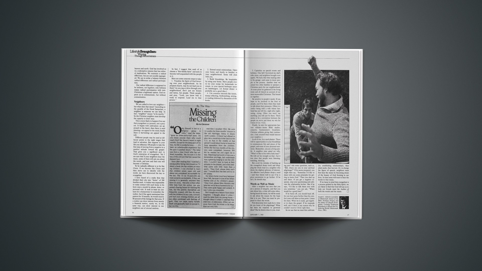 And then I recalled 1954. We were in London for three months’ mission in the old Harringay Arena in dreary north London. A friend had offered to give me a round-trip ticket back to the U.S. so that in the middle of that period I could return home to break the long separation from the children. When the first two months of the mission were completed, however, Bill felt he needed me and urged me to stay. Watching God work in lives was a tremendous privilege, but underneath was a growing longing to see the children. I couldn’t bear to look at their pictures on the dresser, and when bedtime came with little more than a quick, “Dear God, please bless each one,” I would dive into bed and try to fall asleep.