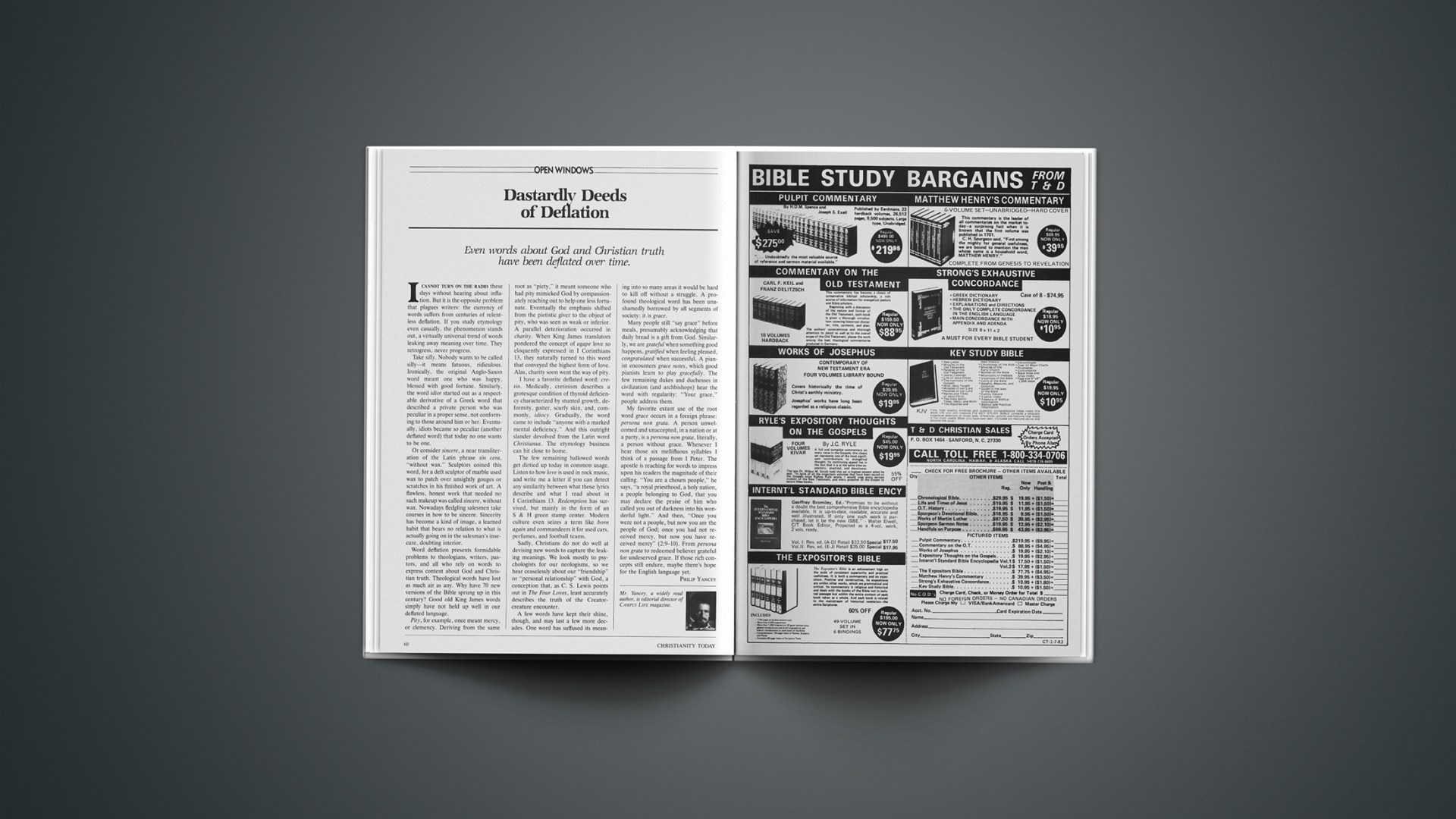 Word deflation presents formidable problems to theologians, writers, pastors, and all who rely on words to express content about God and Christian truth. Theological words have lost as much air as any. Why have 70 new versions of the Bible sprung up in this century? Good old King James words simply have not held up well in our deflated language.