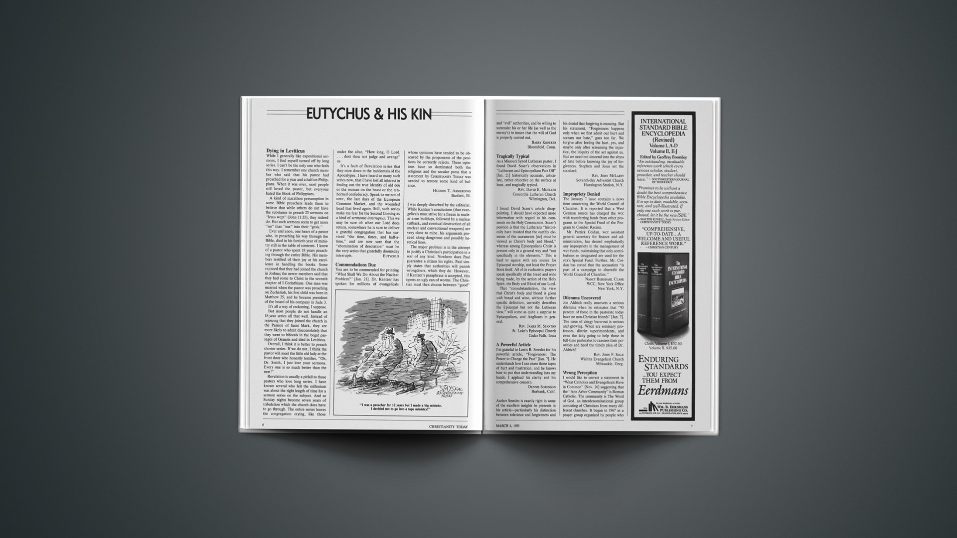 I was deeply disturbed by the editorial. While Kantzer’s conclusions (that evangelicals must strive for a freeze in nuclear arms buildups, followed by a nuclear cutback, and eventual destruction of all nuclear and conventional weapons) are very close to mine, his arguments proceed along dangerous and possibly heretical lines.