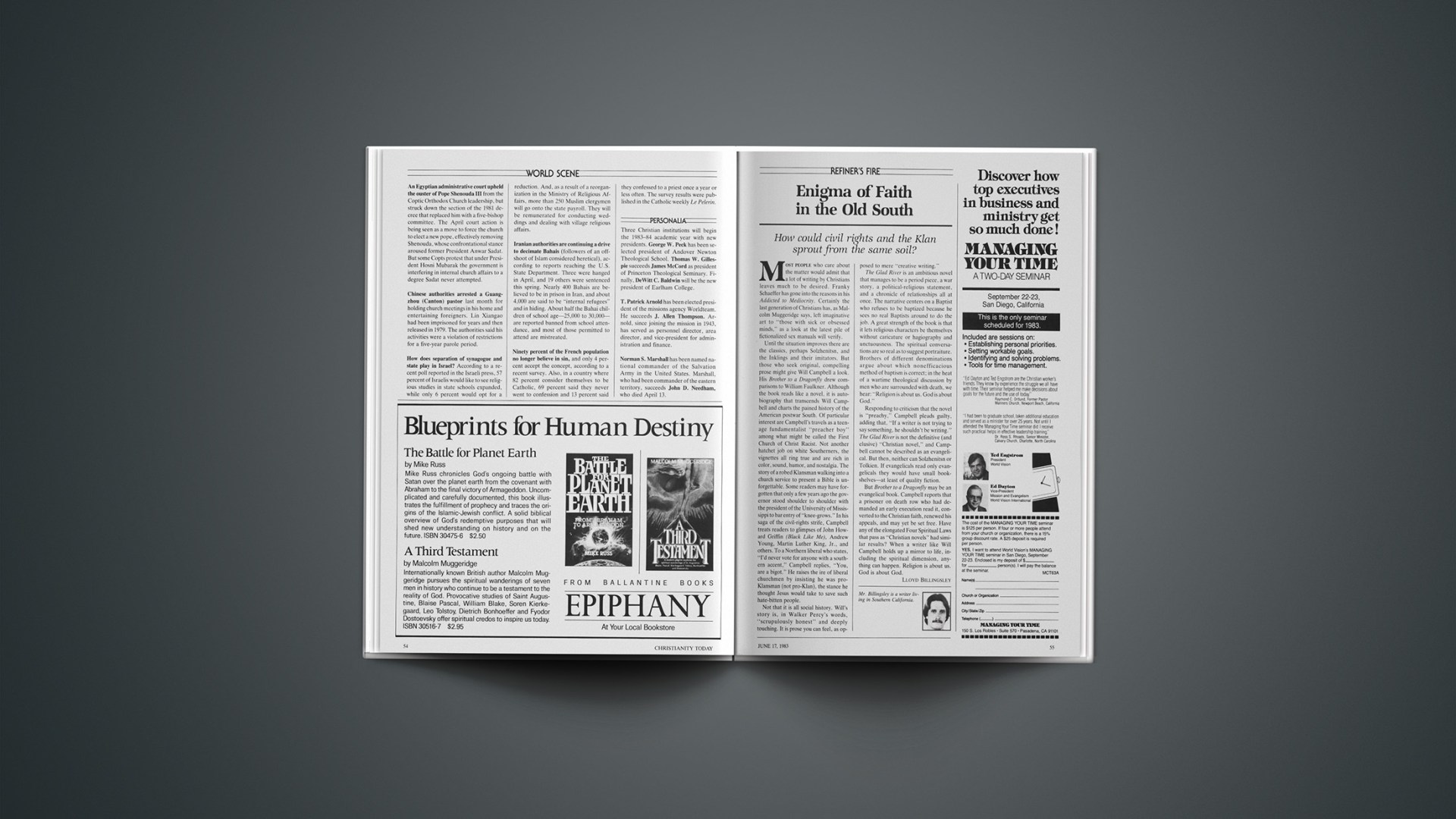 Until the situation improves there are the classics, perhaps Solzhenitsn, and the Inklings and their imitators. But those who seek original, compelling prose might give Will Campbell a look. His Brother to a Dragonfly drew comparisons to William Faulkner. Although the book reads like a novel, it is autobiography that transcends Will Campbell and charts the pained history of the American postwar South. Of particular interest are Campbell’s travels as a teenage fundamentalist “preacher boy” among what might be called the First Church of Christ Racist. Not another hatchet job on white Southerners, the vignettes all ring true and are rich in color, sound, humor, and nostalgia. The story of a robed Klansman walking into a church service to present a Bible is unforgettable. Some readers may have forgotten that only a few years ago the governor stood shoulder to shoulder with the president of the University of Mississippi to bar entry of “knee-grows.” In his saga of the civil-rights strife, Campbell treats readers to glimpses of John Howard Griffin (Black Like Me), Andrew Young, Martin Luther King, Jr., and others. To a Northern liberal who states, “I’d never vote for anyone with a southern accent,” Campbell replies, “You, are a bigot.” He raises the ire of liberal churchmen by insisting he was pro-Klansman (not pro-Klan), the stance he thought Jesus would take to save such hate-bitten people.