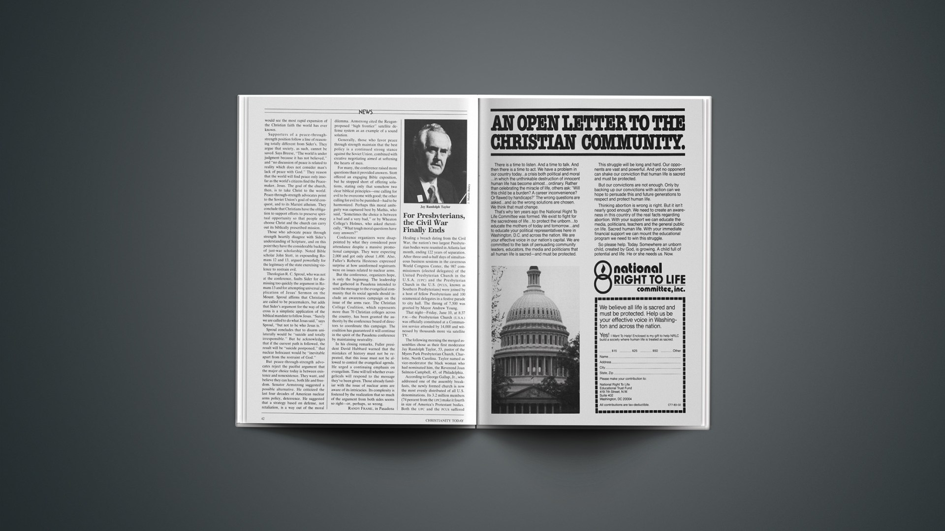 For evangelicals, the assembly news was both good and bad. On the plus side: the new emphasis on evangelism and the provision for evangelical advisers to the General Assembly Council. On the minus side: preoccupation with a host of social and political issues (on which evangelicals themselves may be divided), which consumed most of the assembly’s time and effort and betrayed where the major focus of Presbyterian concern really lies. As the final session drew to a close, a southern commissioner went to a microphone to express anxiety over the reactions of many individuals in churches whose decisions to remain or leave will be determined by the course charted by the assembly for the new denomination. Moderator Taylor had earlier given assurance of his empathy with these troubled conservatives, but he also stressed the need for “affirming” homosexuals. Presbyterians for Lesbian/Gay Concerns was highly visible during the assembly. The organization staffed a booth, dispensed literature, and sponsored a luncheon attended by about 100 and addressed by Kathy Conner, widow of former UPC moderator John Conner. Mrs. Conner expressed hope that the church’s 1978 “definitive guidance” barring the ordination of “unrepentant” homosexuals would not remain “definitive” for long.