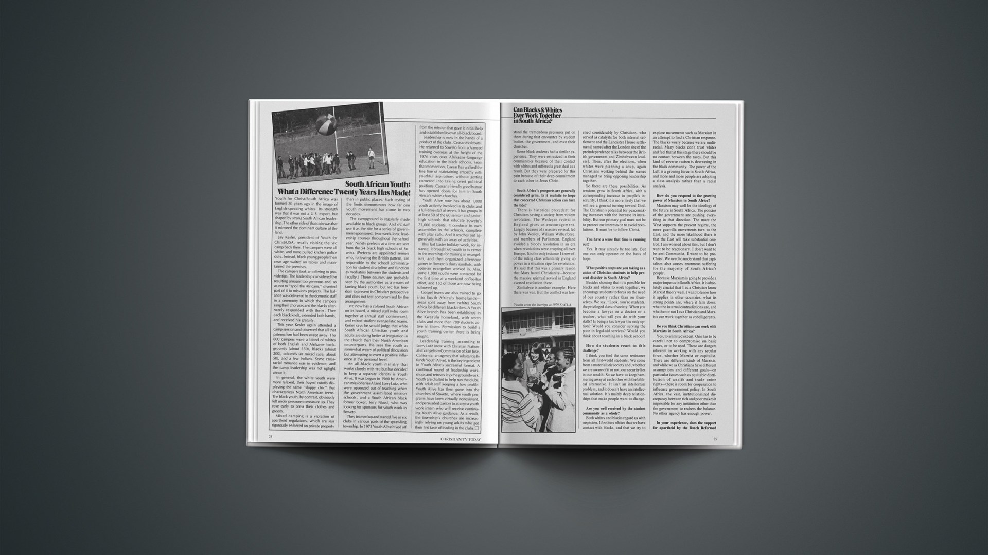 Leadership training, according to Lorry Lutz (now with Christian Nationals Evangelism Commission of San Jose, California, an agency that substantially funds Youth Alive), is the key ingredient in Youth Alive’s successful format. A continual round of leadership workshops and retreats lays the groundwork. Youth are drafted to help run the clubs, with adult staff keeping a low profile. Youth Alive has then gone into the churches of Soweto, where youth programs have been virtually nonexistent, and persuaded pastors to accept a youth work intern who will receive continuing Youth Alive guidance. As a result, the township’s churches are increasingly relying on young adults who got their first taste of leading in the clubs.