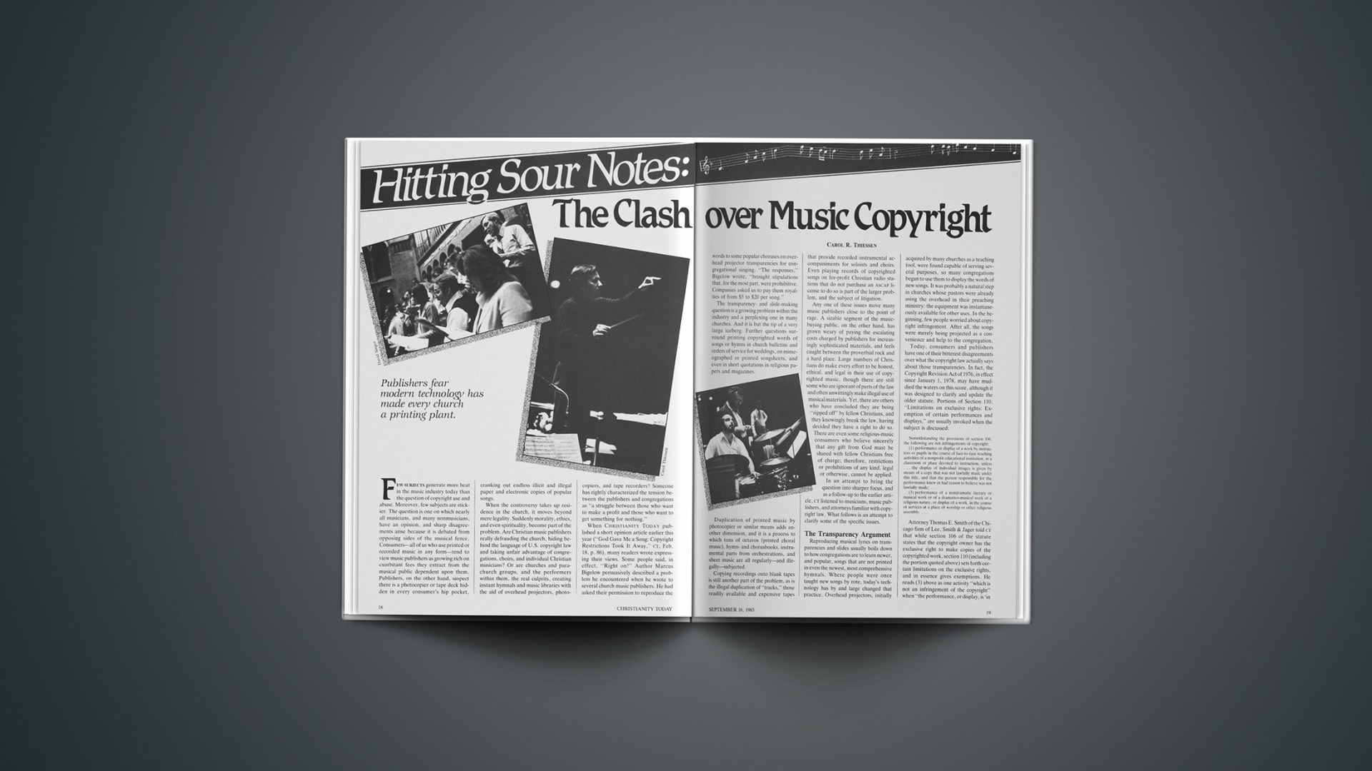 When CHRISTIANITY TODAY published a short opinion article earlier this year (“God Gave Me a Song: Copyright Restrictions Took It Away,” CT, Feb. 18, p. 86), many readers wrote expressing their views. Some people said, in effect, “Right on!” Author Marcus Bigelow persuasively described a problem he encountered when he wrote to several church music publishers. He had asked their permission to reproduce the words to some popular choruses on overhead projector transparencies for congregational singing. “The responses,” Bigelow wrote, “brought stipulations that, for the most part, were prohibitive. Companies asked us to pay them royalties of from $5 to $20 per song.”