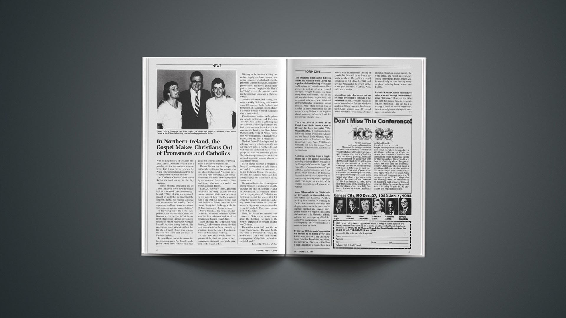 In the week prior to the Belfast symposium, a BBC reporter told Colson that his name was on the “hit list” of the IRA (Irish Republican Army), presumably because of Prison Fellowship Northern Ireland’s activities among inmates. The symposium passed without incident, but the alleged death threat was symptomatic of the strife that continues in Northern Ireland.