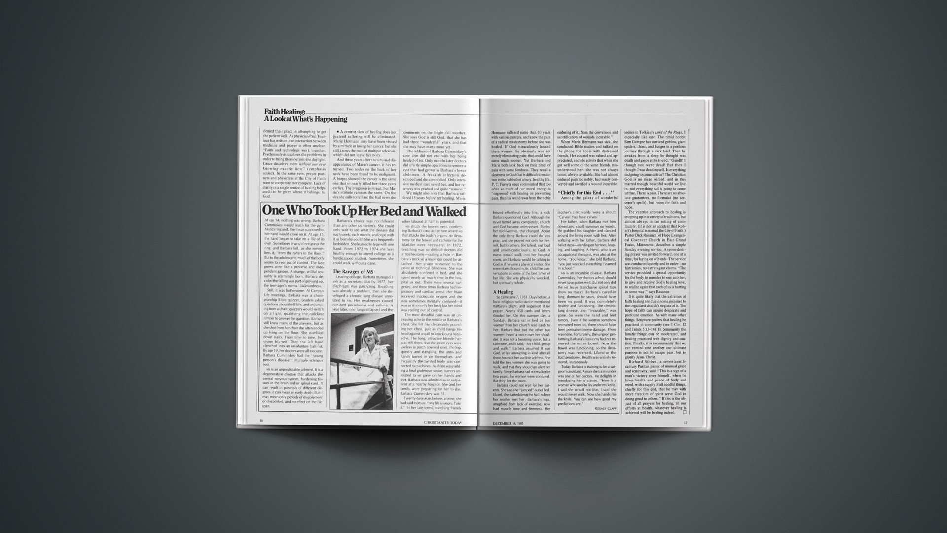 Still, it was bothersome. At Campus Life meetings, Barbara was a championship Bible quizzer. Leaders asked questions about the Bible, and on jumping from a chair, quizzers would switch on a light, qualifying the quickest jumper to answer the question. Barbara still knew many of the answers, but as she shot from her chair she often ended up lying on the floor. She stumbled down stairs. From time to time, her vision blurred. Then the left hand clenched into an involuntary half-fist. By age 19, her doctors were all too sure. Barbara Cummiskey had the “young person’s disease”: multiple sclerosis (MS).