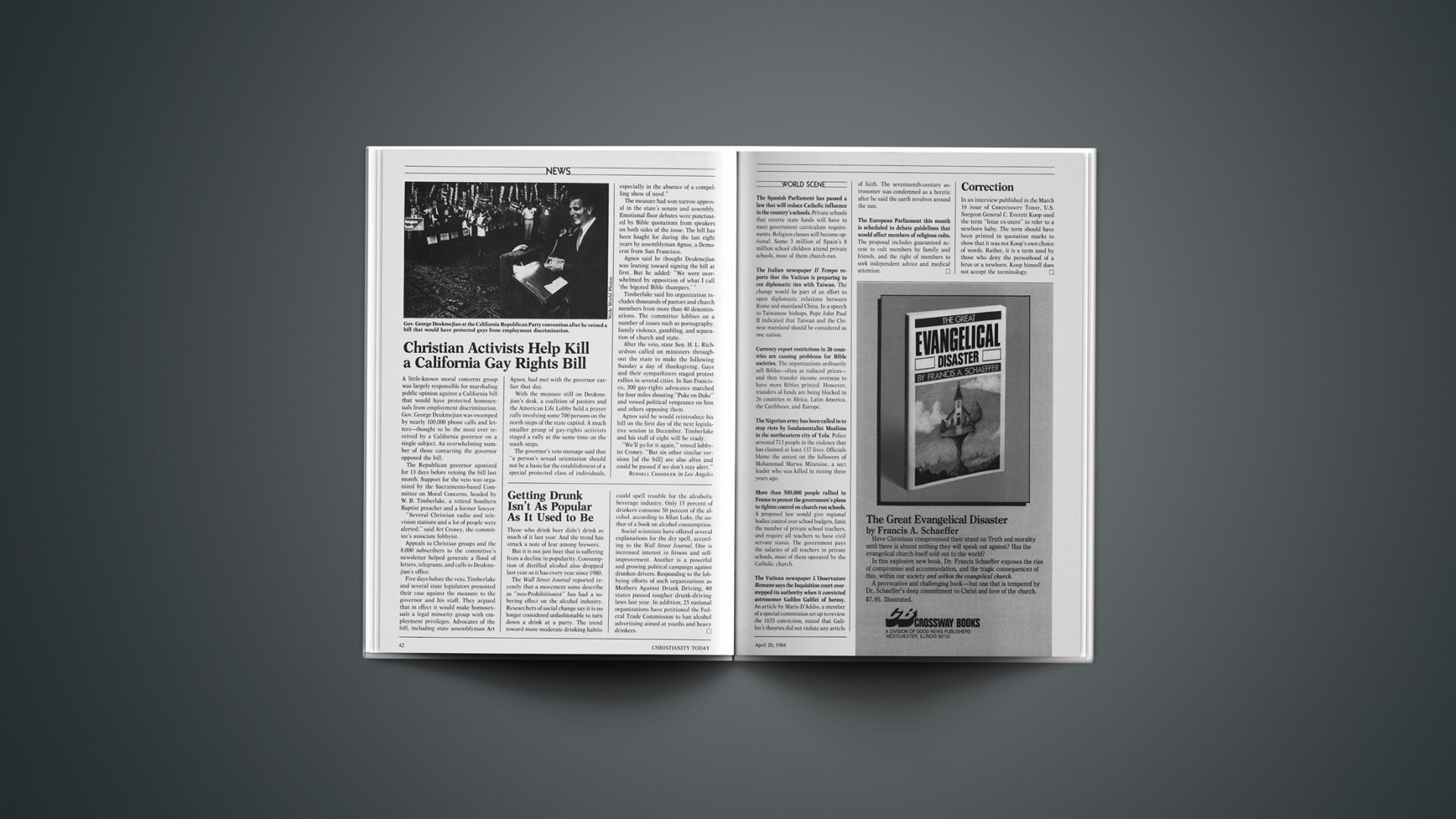 A little-known moral concerns group was largely responsible for marshaling public opinion against a California bill that would have protected homosexuals from employment discrimination. Gov. George Deukmejian was swamped by nearly 100,000 phone calls and letters—thought to be the most ever received by a California governor on a single subject. An overwhelming number of those contacting the governor opposed the bill.