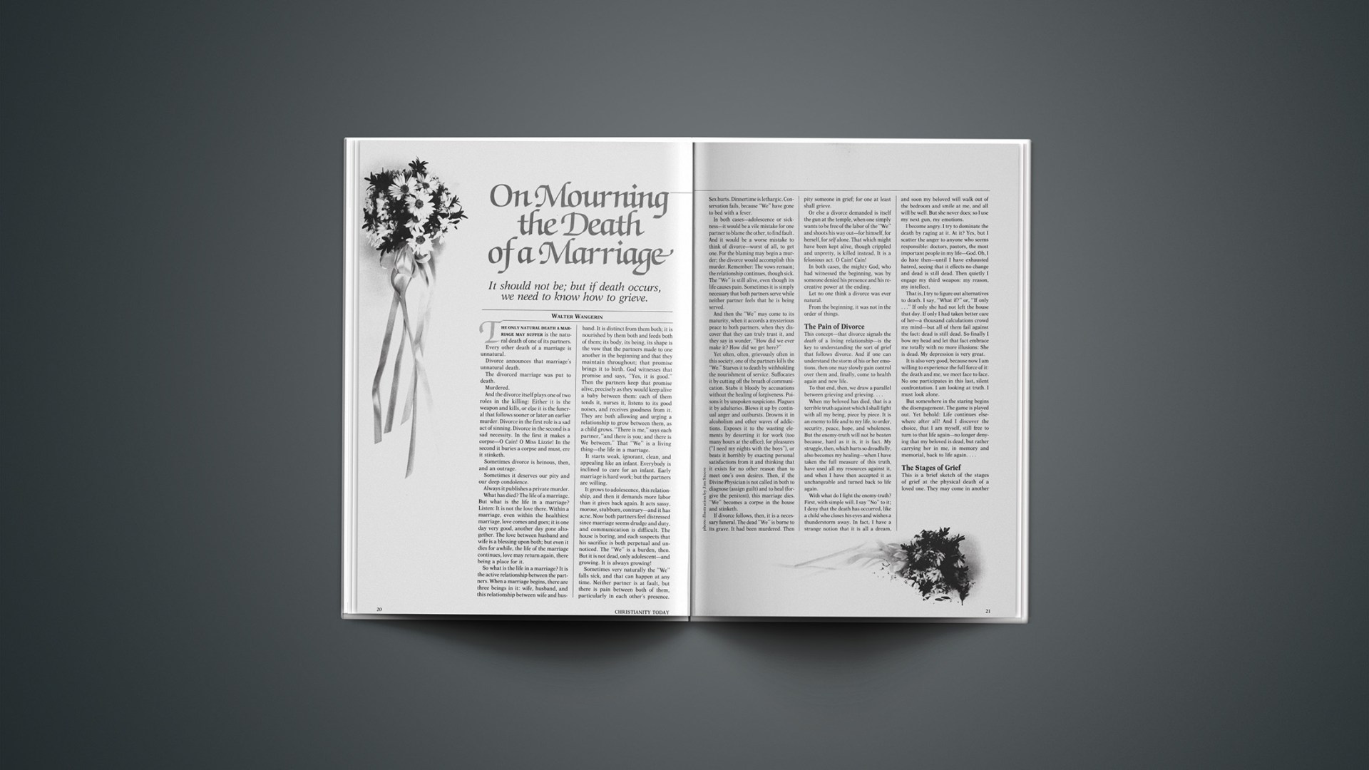 This concept—that divorce signals the death of a living relationship—is the key to understanding the sort of grief that follows divorce. And if one can understand the storm of his or her emotions, then one may slowly gain control over them and, finally, come to health again and new life.