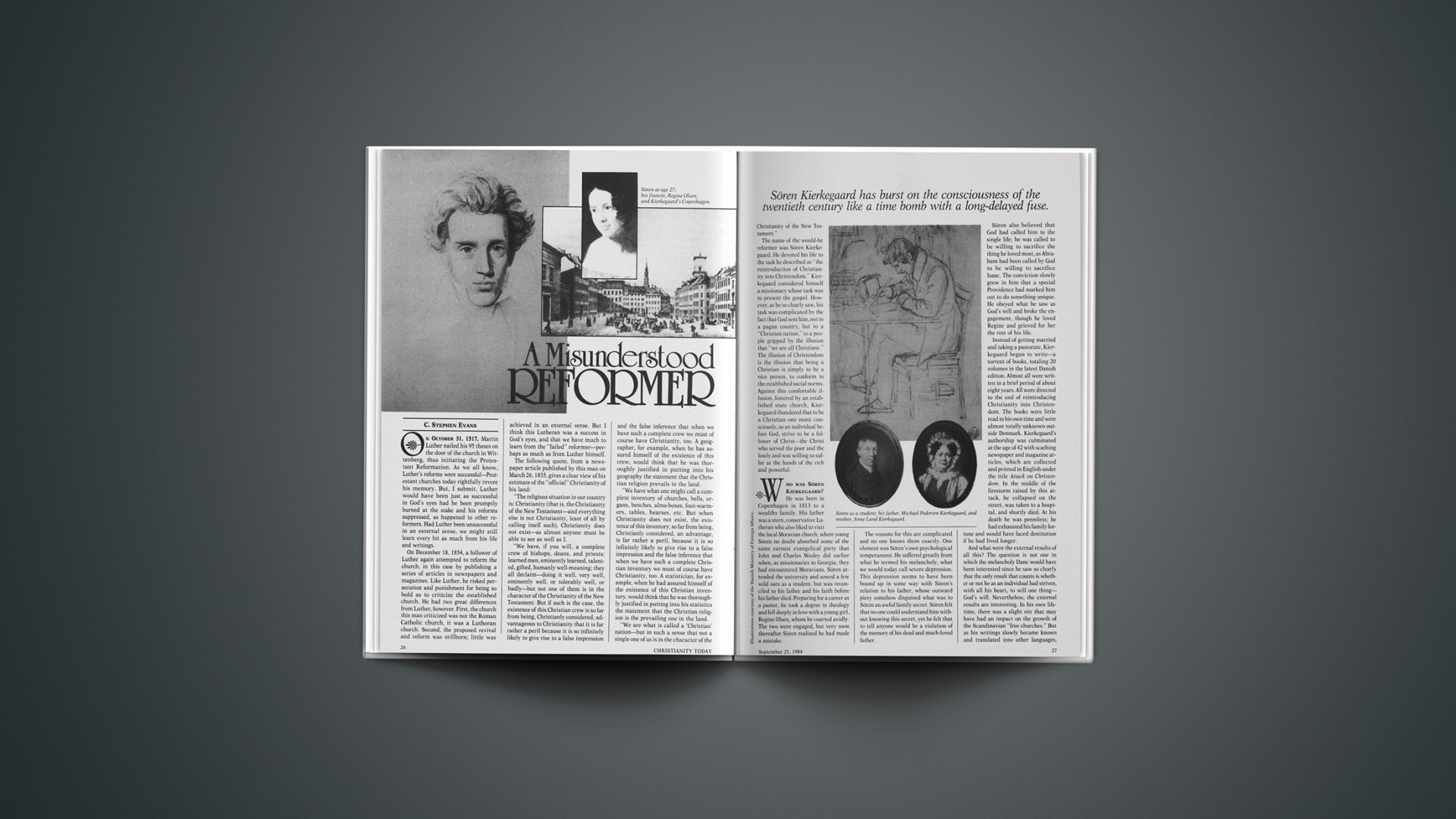 Who was Sören Kierkegaard? He was born in Copenhagen in 1813 to a wealthy family. His father was a stern, conservative Lutheran who also liked to visit the local Moravian church, where young Sören no doubt absorbed some of the same earnest evangelical piety that John and Charles Wesley did earlier when, as missionaries to Georgia, they had encountered Moravians. Sören attended the university and sowed a few wild oats as a student, but was reconciled to his father and his faith before his father died. Preparing for a career as a pastor, he took a degree in theology and fell deeply in love with a young girl, Regine Olsen, whom he courted avidly. The two were engaged, but very soon thereafter Sören realized he had made a mistake.