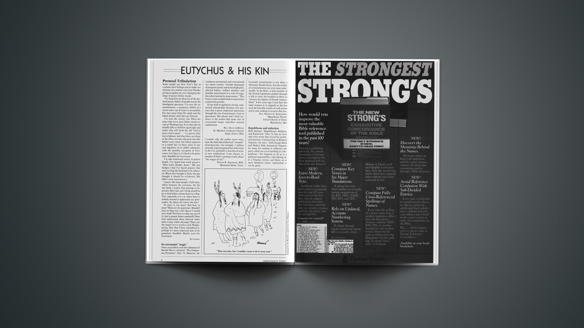 I was sitting here in my office this morning, feeling sorry for myself. While trying to come to terms with the situations that helped cause my state, I started to read your section of gripes and praises. I started to feel uplifted. I am not sure why but: (1) Seeing a broader picture of the church, with all her various arms and efforts—and subsequent troubles, both major and minor—helped put mine into perspective; (2) Big guys (i.e., letters about Schuller, et al.) and little guys (i.e., me) all face adversity; (3) Though there are obvious disagreements, it put my mind into a cognitive mode, and out of the negative.